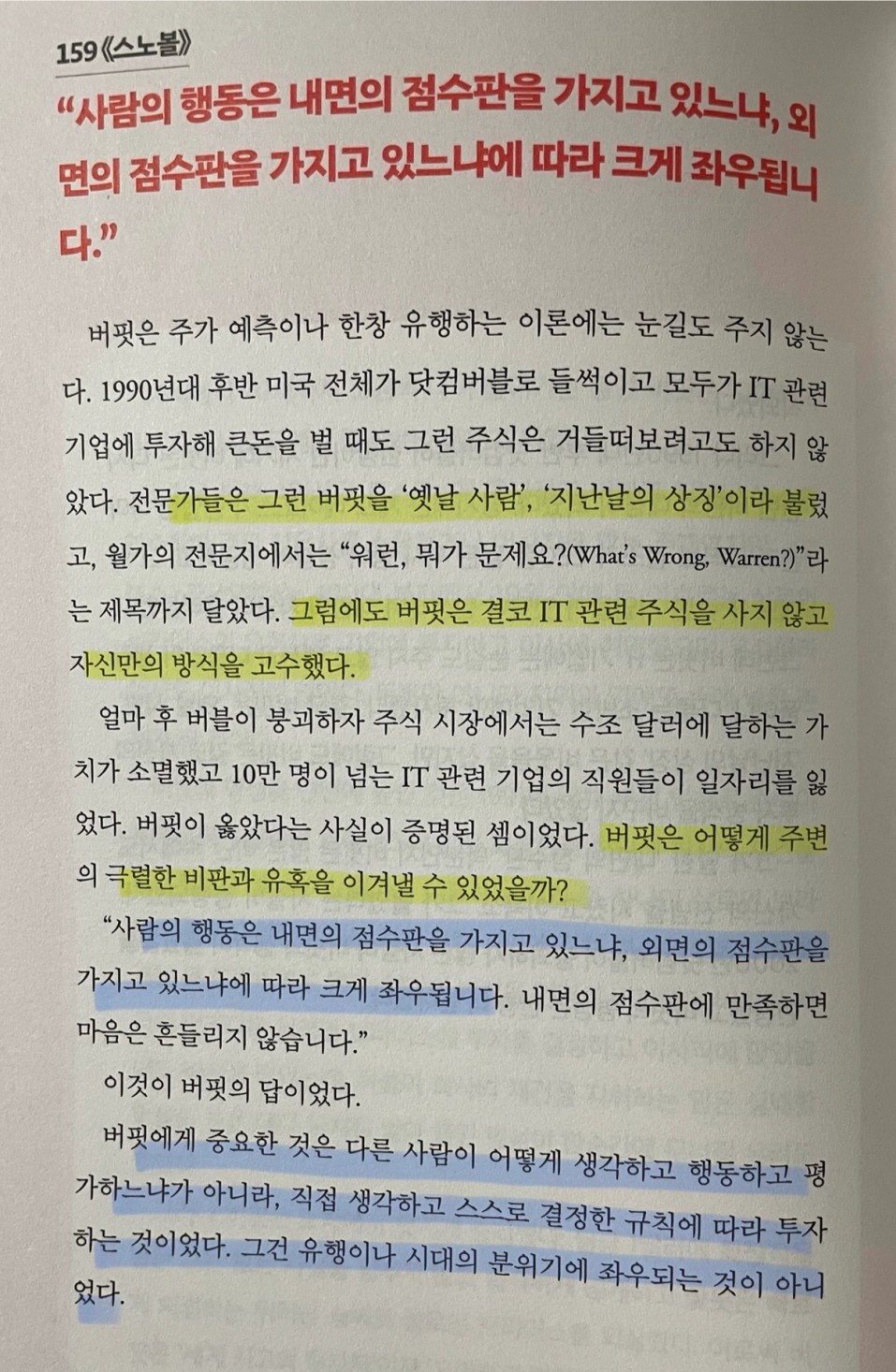 p.182 "사람의 행동은 내면의 점수판을 가지고 있느냐, 외면의 점수판을 가지고 있느냐에 따라 크게 좌우됩니다." .. 버핏에게 중요한 것은 다른 사람이 어떻게 생각하고 행동하고 평가하느냐가 아니라, 직접 생각하고 스스로 결정한 규칙에 따라 투자하는 것이었다.