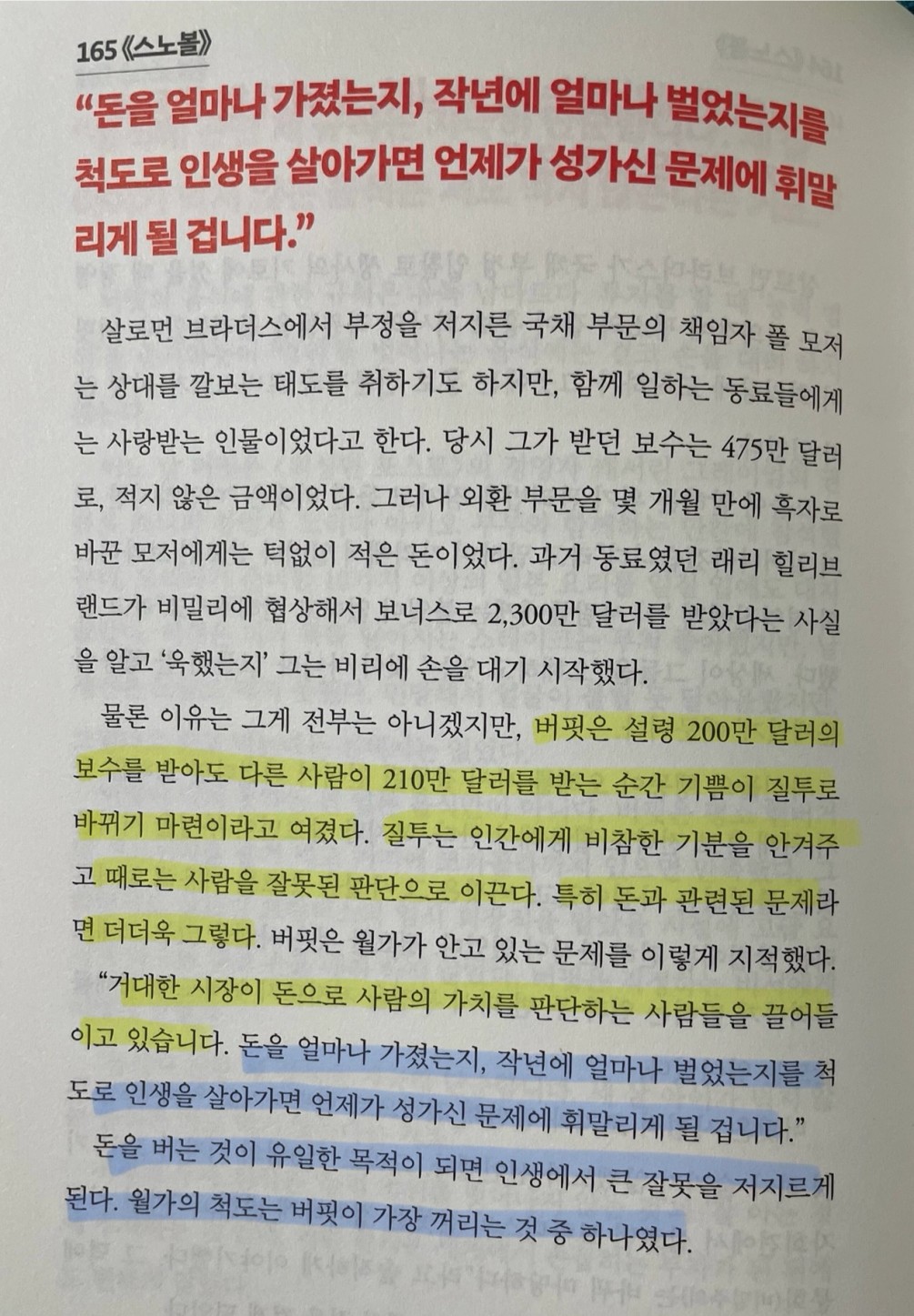 p.188 "돈을 얼마나 가졌는지, 작년에 얼마나 벌었는지를 척도로 인생을 살아가면 언젠가 성가신 문제에 휘말리게 될 겁니다." 돈을 버는 것이 유일한 목적이 되면 인생에서 큰 잘못을 저지르게 된다. 월가의 척도는 버핏이 가장 꺼리는 것 중 하나였다.