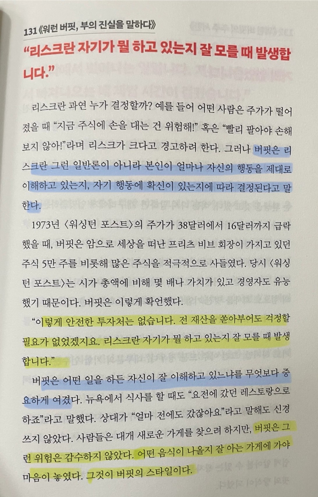 p.151 "리스크란 자기가 뭘 하고 있는지 잘 모를 때 발생합니다." 버핏은 어떤 일을 하든 자신이 잘 이해하고 있느냐를 무엇보다 중요하게 여겼다.