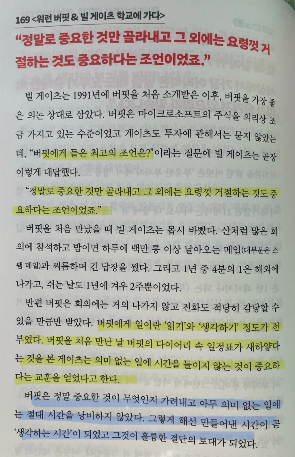 p.192 버핏에게 일이란 '읽기'와 생각하기' 정도가 전부였다. .. 버핏은 정말 중요한 것이 무엇인지 가려내고 아무 의미 없는 일에는 절대 시간을 낭비하지 않았다. 그렇게 해서 만들어낸 시간이 곧 '생각하는 시간'이 되었고 그것이 훌륭한 결단의 토대가 되었다.
