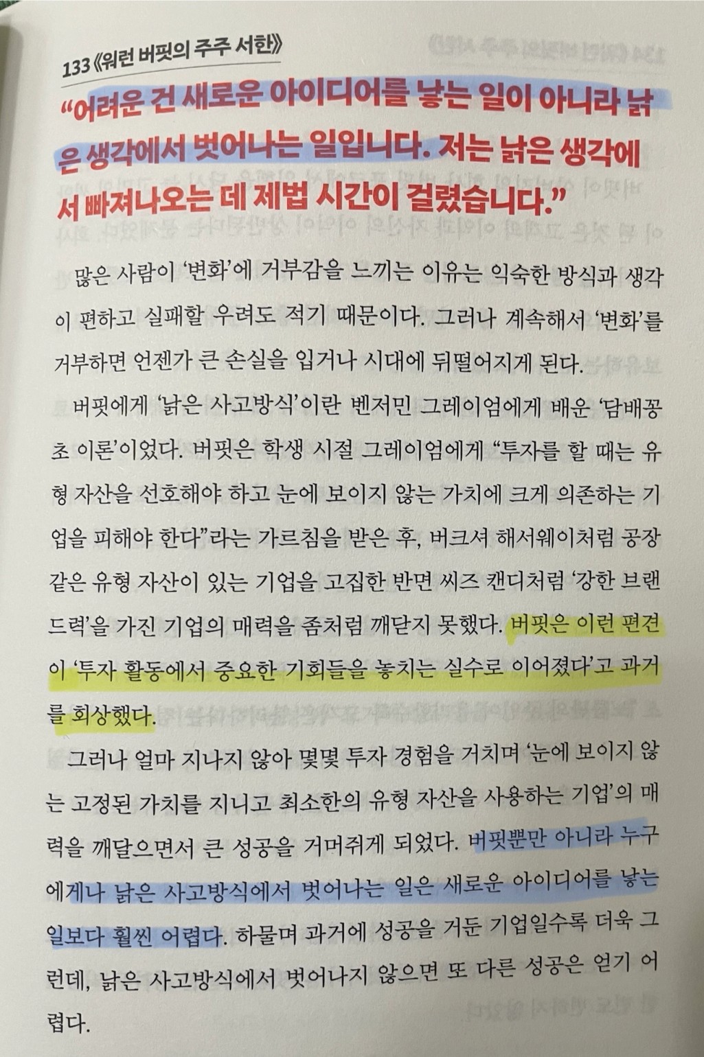 p.153 "어려운 건 새로운 아이디어를 낳는 일이 아니라 낡은 생각에서 벗어나는 일입니다." .. 버핏은 이런 편견이 '투자 활동에서 중요한 기회들을 놓치는 실수로 이어졌다'고 과거를 회상했다.