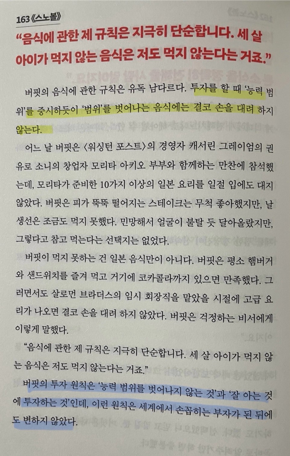 p.186 버핏의 투자 원칙은 '능력 범위를 벗어나지 않는 것'과 '잘 아는 것에 투자하는 것'인데, 이런 원칙은 세계에서 손꼽히는 부자가 된 뒤에도 변하지 않았다.