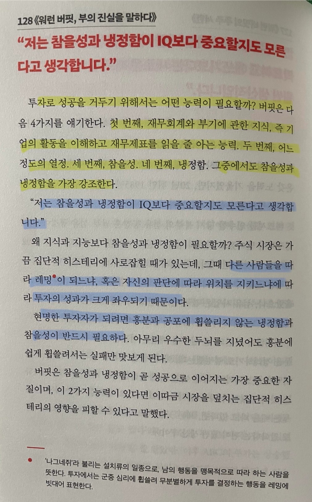p.148 "저는 참을성과 냉정함이 IQ보다 중요할지도 모른다고 생각합니다." .. 다른 사람들을 따라 레밍이 되느냐, 혹은 자신의 판단에 따라 위치를 지키느냐에 따라 투자의 성과가 크게 좌우.. 현명한 투자자가 되려면 흥분과 공포에 휩쓸리지 않는 냉정함과 참을성이 반드시 필요하다.