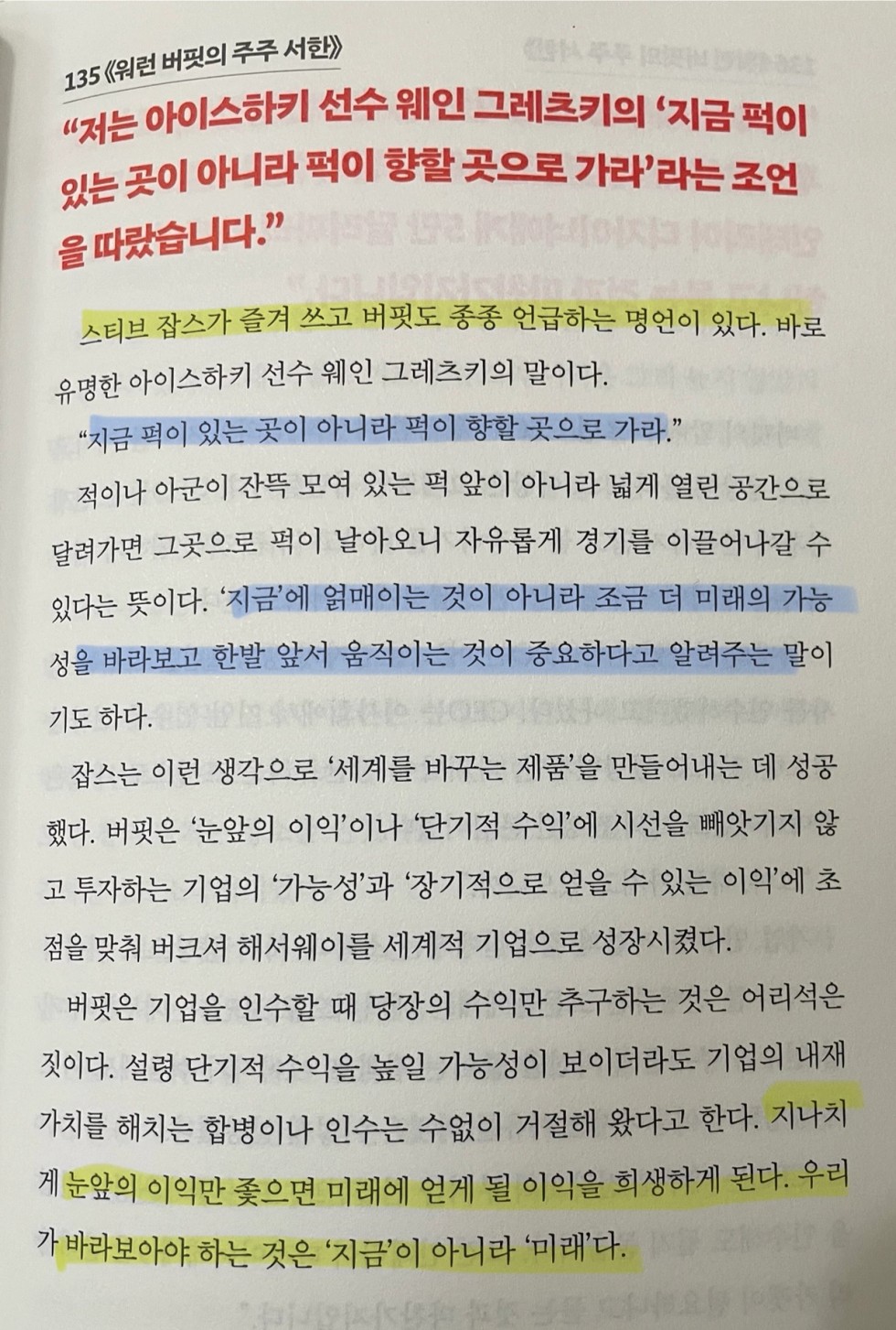 p.155 "지금 퍽이 있는 곳이 아니라 퍽이 향할 곳으로 가라." .. '지금'에 얽매이는 것이 아니라 조금 더 미래의 가능성을 바라보고 한발 앞서 움직이는 것이 중요하다.. 지나치게 눈앞의 이익만 좇으면 미래에 얻게 될 이익을 희생하게 된다. 우리가 바라보아야 하는 것은 '지금'이 아니라 '미래'다.