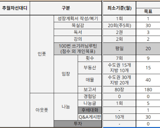 임장 목표: 횟수 12회 / 부동산 15곳 / 매물 50개 / 임보 150장