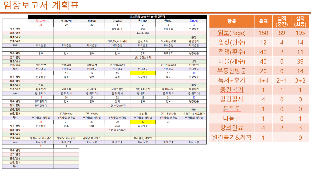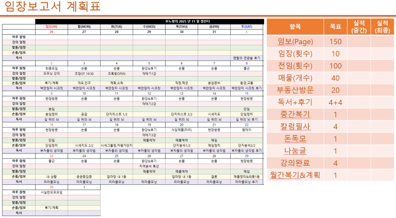 - 임장 : 전화임장 목표 한참 미달 → 전화임장에 대한 의미를 명확히 알지 못했음 → 25년 11월 개선 포인트