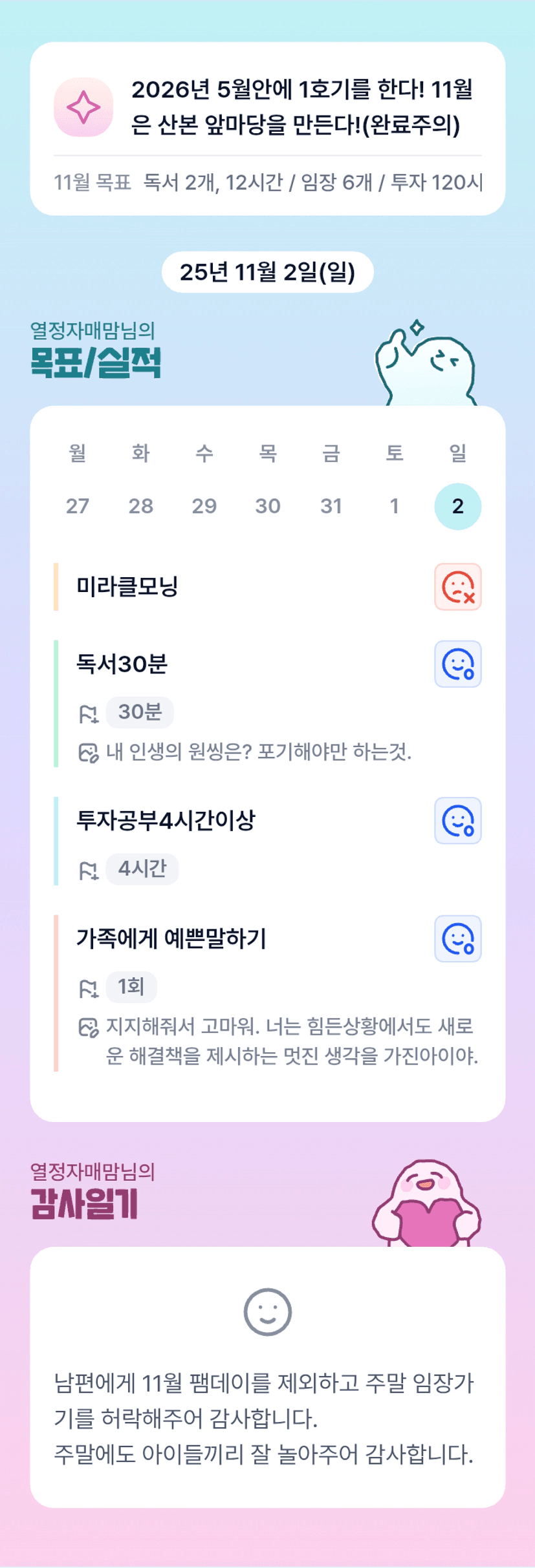 아이에게 예쁜말로 응원과 격려해주는 멋진 엄마세요😊 요번달 목표도 꼭 달성하실 수 있을꺼예요! 11월도 파이팅입니다~~🌈