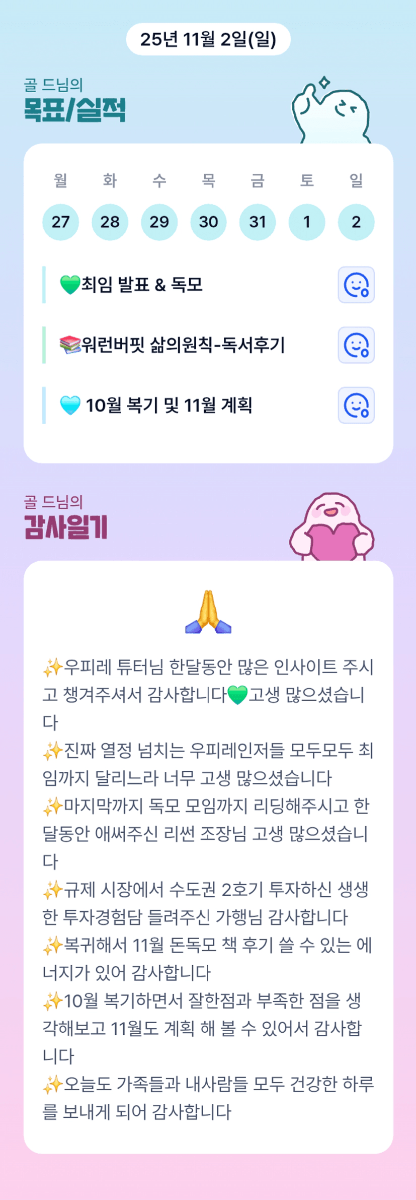 멋지게 한 달을 마무리하셨네요👍 11월 한 달도 빠팅입니다😊
