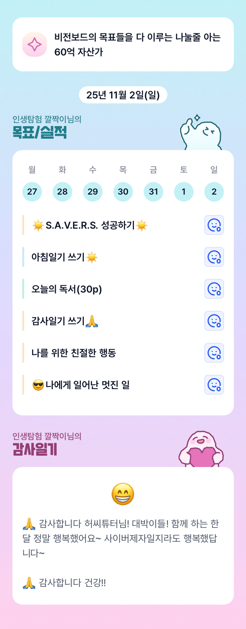 깔짝이님 바다와 육지에서 종횡무진 활약했던 한달 수고 하셨어요. 11월도 원하시는 목표 착착 다 이뤄가시길 항상 응원하겠습니다^^