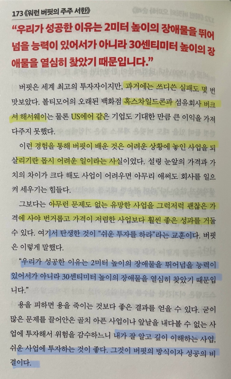 p.196 "우리가 성공한 이유는 2미터 높이의 장애물을 뛰어넘을 능력이 있어서가 아니라 30센티미터 높이의 장애물을 열심히 찾았기 때문입니다." .. 내가 잘 알고 깊이 이해하는 사업, 쉬운 사업에 투자하는 것이 좋다. 그것이 버핏의 방식이자 성공의 비결이다.