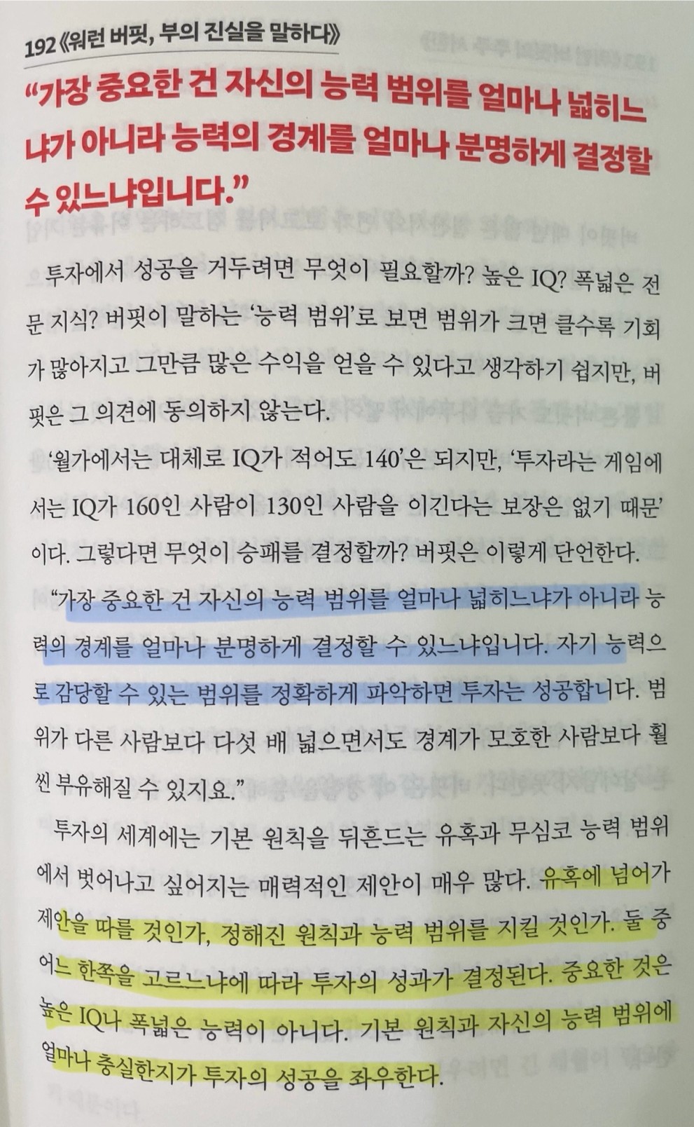 p.215 "가장 중요한 건 자신의 능력 범위를 얼마나 넓히느냐가 아니라 능력의 경계를 얼마나 분명하게 결정할 수 있느냐입니다." .. 중요한 것은 높은 IQ나 폭넓은 능력이 아니다. 기본 원칙과 자신의 능력 범위에 얼마나 충실한지가 투자의 성공을 좌우한다.