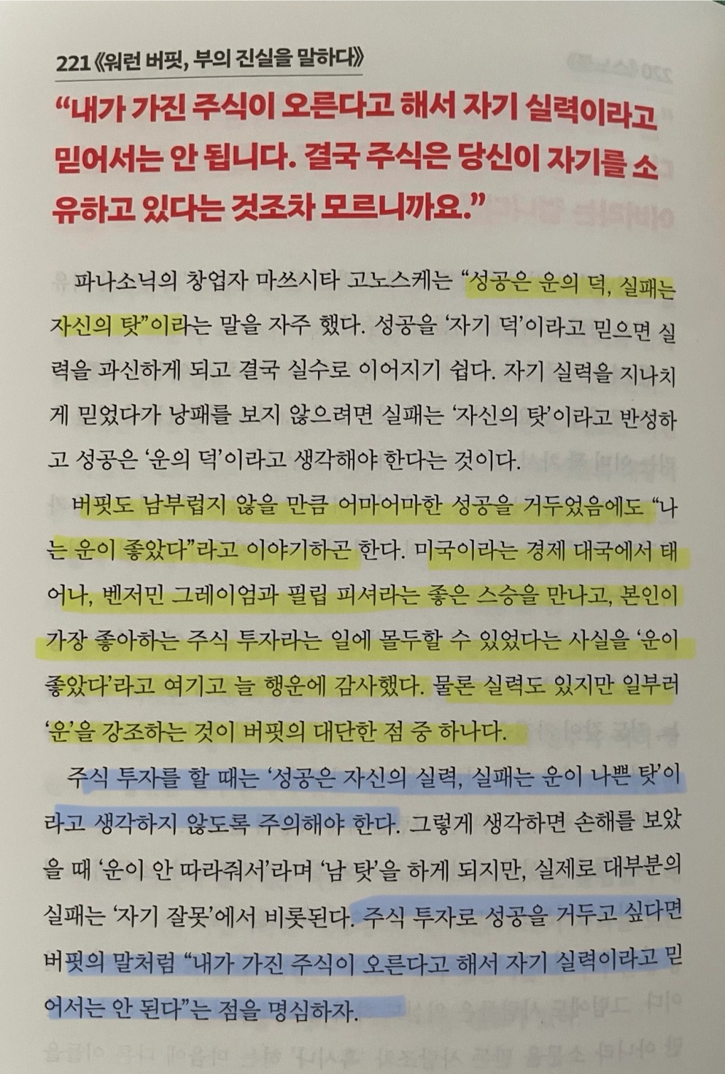 p.244 주식 투자를 할 때는 '성공은 자신의 실력, 실패는 운이 나쁜 탓'이라고 생각하지 않도록 주의해야 한다. .. 주식 투자로 성공을 거두고 싶다면 버핏의 말처럼 "내가 가진 주식이 오른다고 해서 자기 실력이라고 믿어서는 안 된다"는 점을 명심하자.