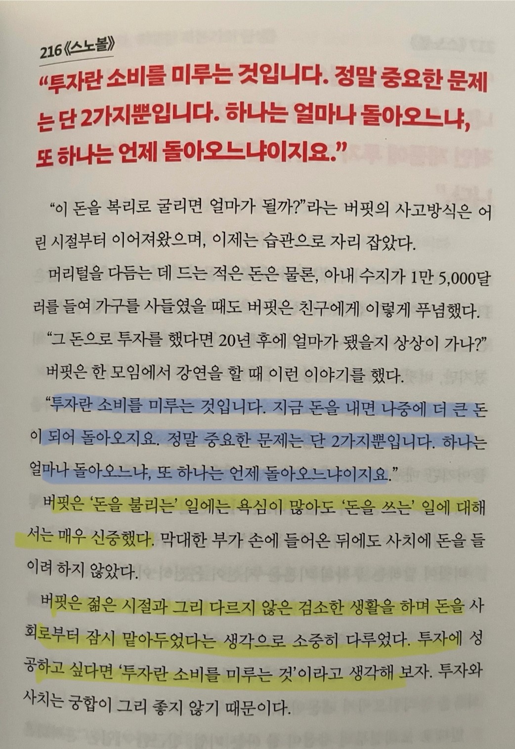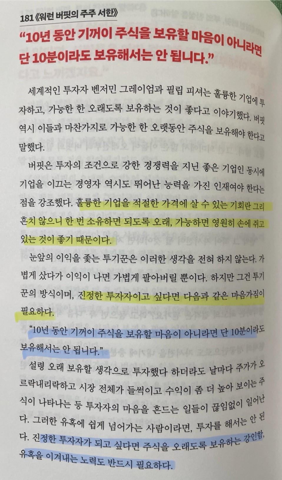p.204 "10년 동안 기꺼이 주식을 보유할 마음이 아니라면 단 10분이라도 보유해서는 안 됩니다." .. 진정한 투자자가 되고 싶다면 주식을 오래도록 보유하는 강인함, 유혹을 이겨내는 노력도 반드시 필요하다.