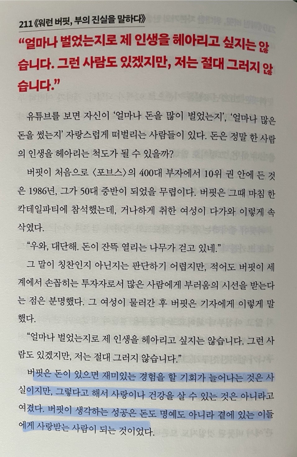 p.234 버핏은 돈이 있으면 재미있는 경험을 할 기회가 늘어나는 것은 사실이지만, 그렇다고 해서 사랑이나 건강을 살 수 있는 것은 아니라고 여겼다. 버핏이 생각하는 성공은 돈도 명예도 아니라 곁에 있는 이들에게 사랑받는 사람이 되는 것이었다.