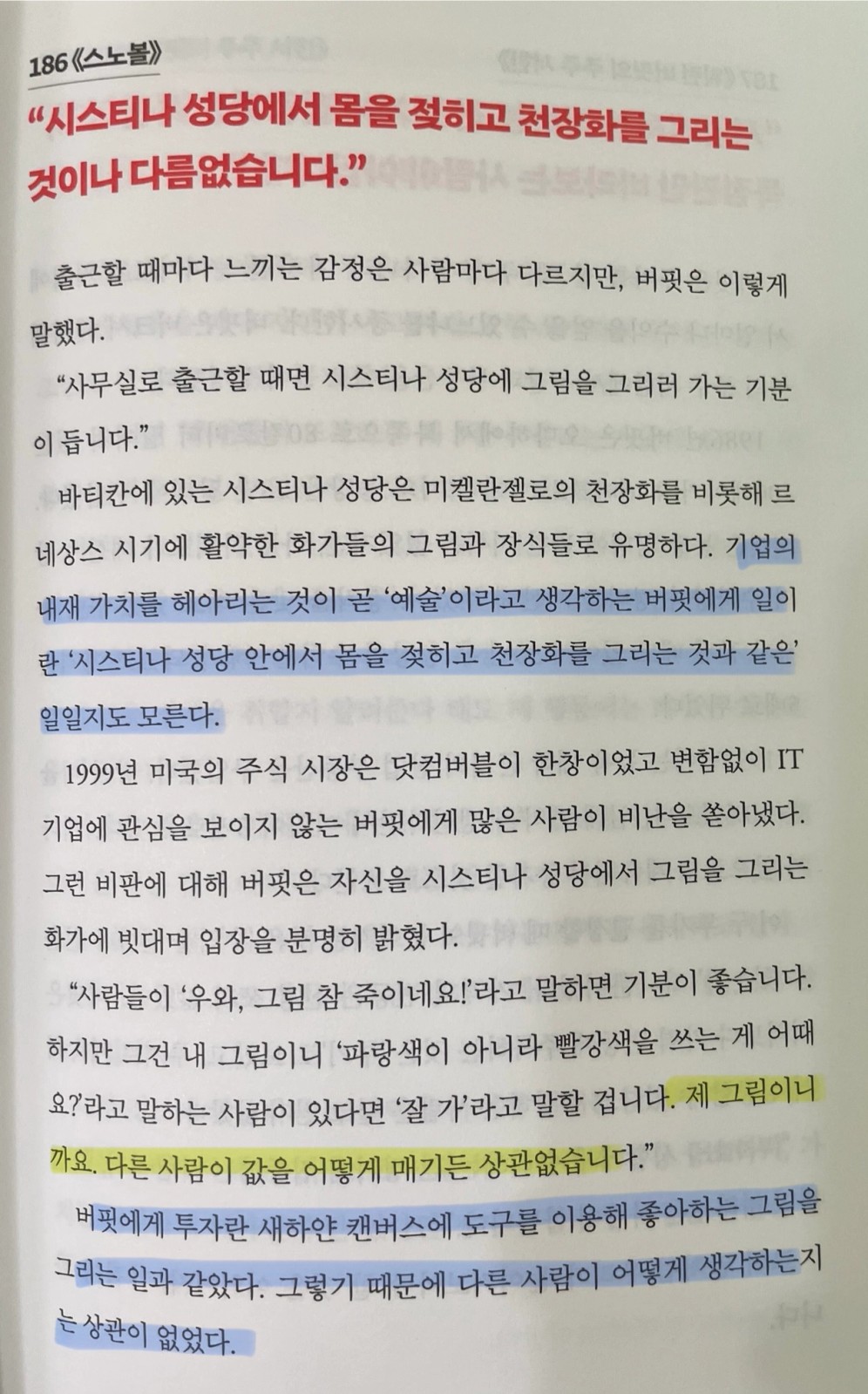 p.209 버핏에게 투자란 새하얀 캔버스에 도구를 이용해 좋아하는 그림을 그리는 일과 같았다. 그렇기 때문에 다른 사람이 어떻게 생각하는지는 상관이 없었다.