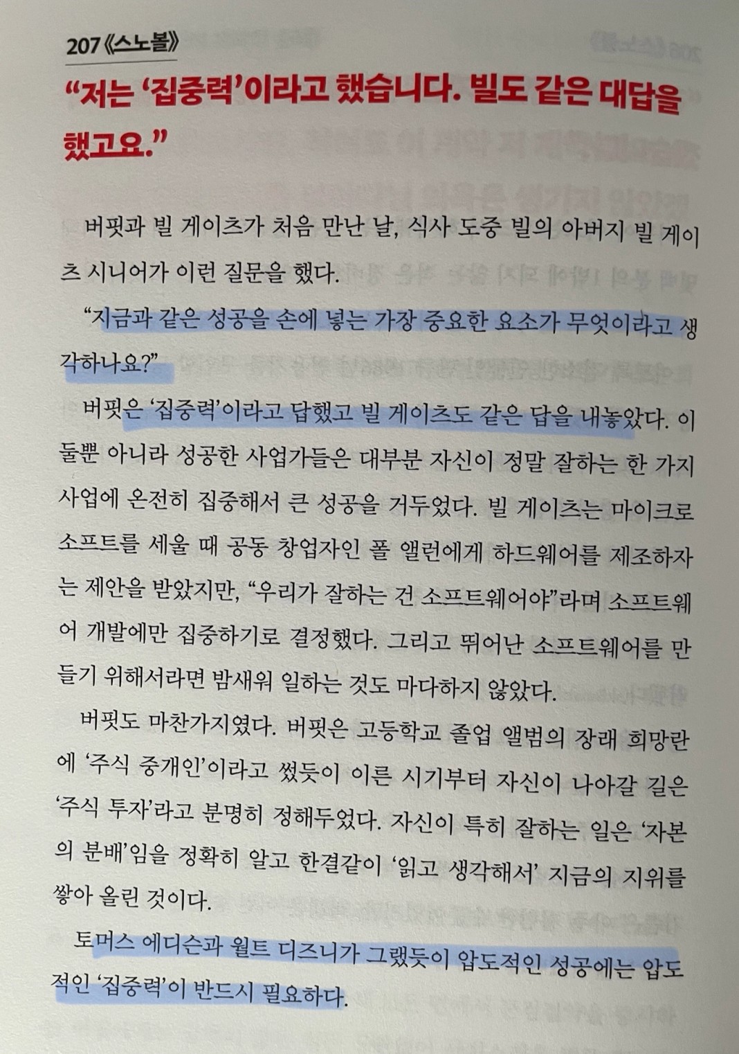 p.230 "지금과 같은 성공을 손에 넣는 가장 중요한 요소가 무엇이라고 생각하나요?" 버핏은 '집중력'이라고 답했고 빌 게이츠도 같은 답을 내놓았다. .. 토머스 에디슨과 월트 디즈니가 그랬듯이 압도적인 성공에는 압도적인 '집중력'이 반드시 필요하다.