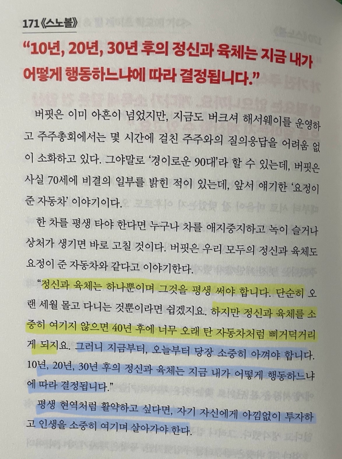 p.194 "10년, 20년, 30년 후의 정신과 육체는 지금 내가 어떻게 행동하느냐에 따라 결정됩니다." 평생 현역처럼 활약하고 싶다면, 자기 자신에게 아낌없이 투자하고 인생을 소중히 여기며 살아가야 한다.