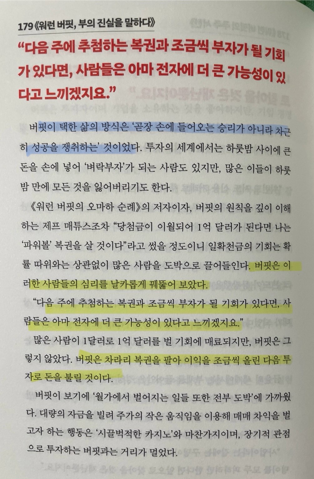 p.202 버핏이 택한 삶의 방식은 '곧장 손에 들어오는 승리가 아니라 차근히 성공을 쟁취하는' 것이었다.