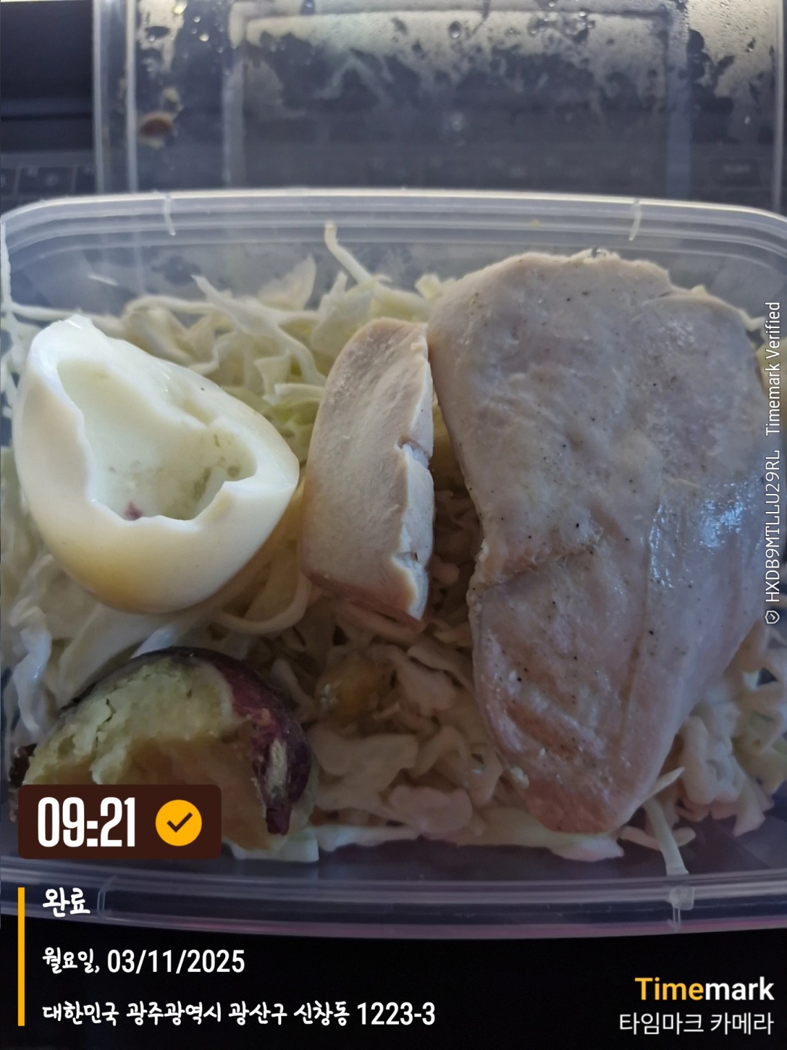 찐계란 흰자만+ 찐고구마 반반개 + 양배추 350그래+ 닭가슴살 100그램