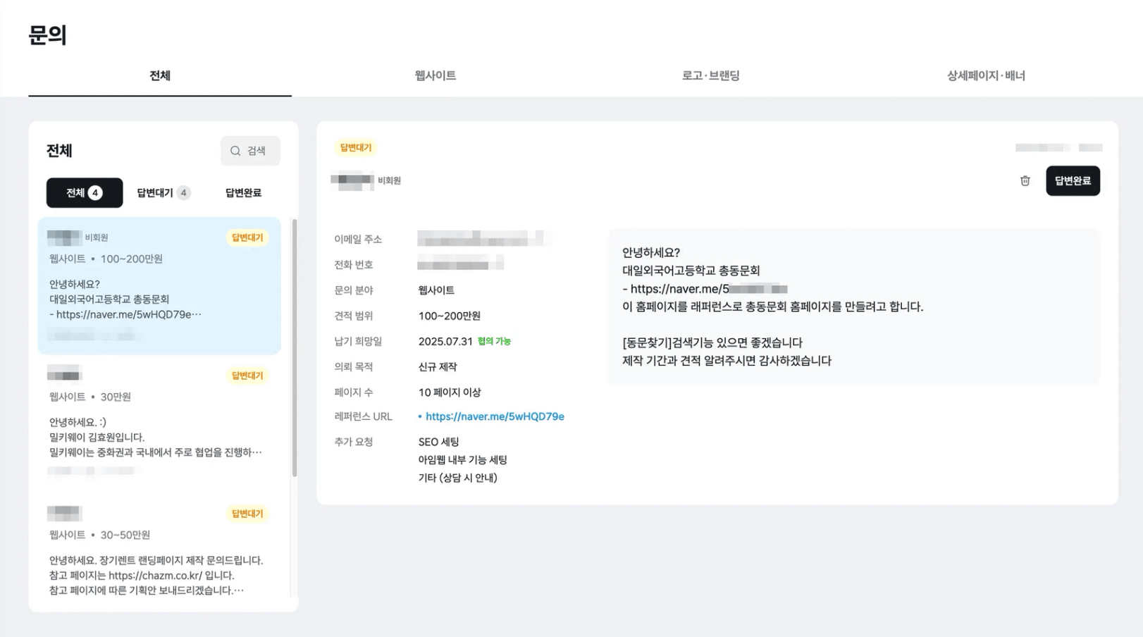 초기엔 크몽이나 아임웹 전문가센터를 통해 문의가 들어왔습니다.