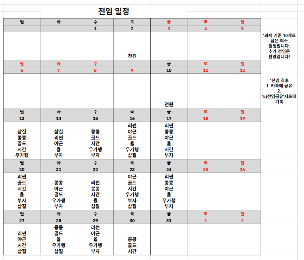 지난 실전반에서 했던 전임 원씽 당번이 도움이 많이 됐어서, 이번달은 조원들의 전임 스케쥴을 짜서 아침 원씽때마다 공유하였습니다!