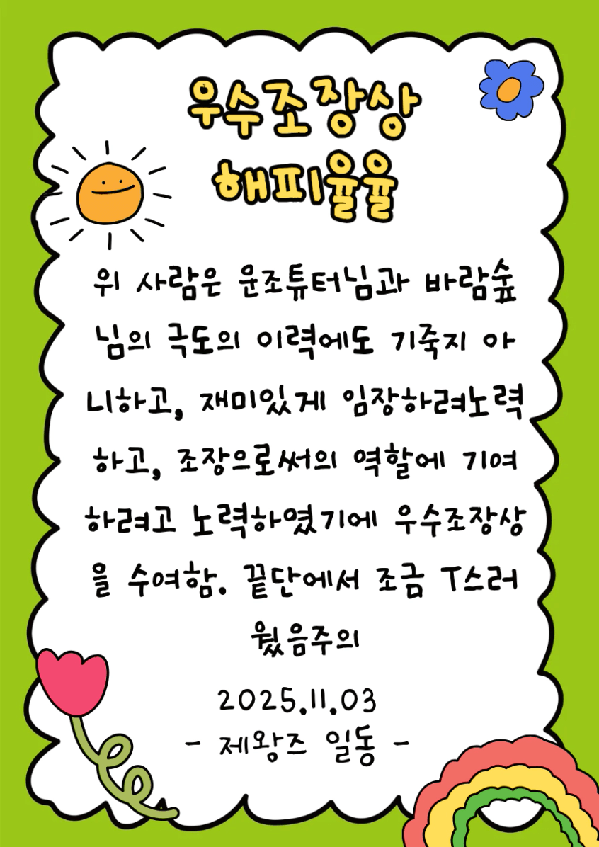 ๊ฐ์‚ฌํ•˜๊ฒŒ๋„ ์ด๋ฒˆ ์‹ค์ „๋ฐ˜ ์ฒซ ์กฐ์žฅ์—ญํ• ์ด๋ผ๋Š” ๊ธฐํšŒ๋ฅผ ์ฃผ์…จ์Šต๋‹ˆ๋‹ค.