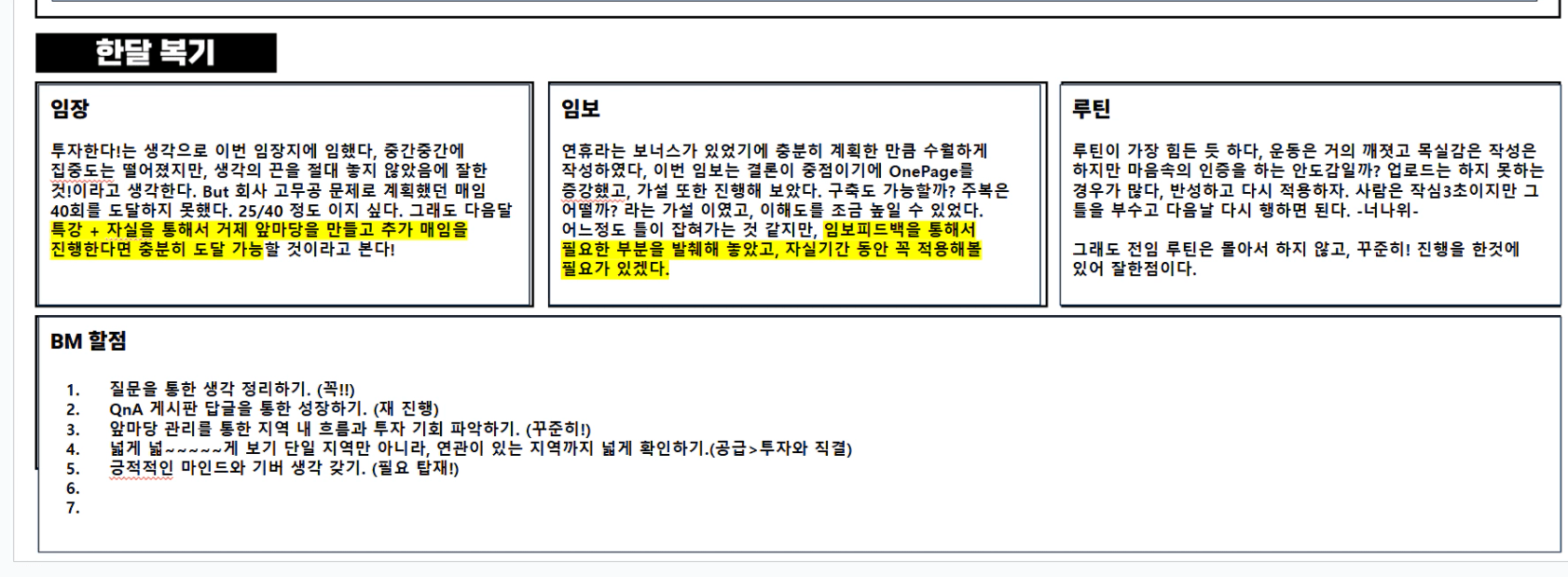 이번 임보는 딱 이 한마디로 정의할 수 있겠다. 결론이 중점이였기에 One-page를 추가 했고, 임장지 후보군에 넣는다는 생각으로 작성했다! 또한 BM해보고자 했던 가설과 검증 구축도 가능할까? 도 이번기회에 해볼 수 있었다, 막연하게 주복도 가능할까? 구축도 가능할까? 외곽 구축은? 이라는 생각을 마음속에만 되 뇌이지말고, 꼭 정리해보는 것이 중요한 것임을 깨닫게 되는 BM이였다. 또한 임보피드백을 통해 부족한 부분을 채워나가고, 내가 정리한것이 맞는지 튜터님과의 생각과 연결지어보자.(이만한 가성비가 없다!!)