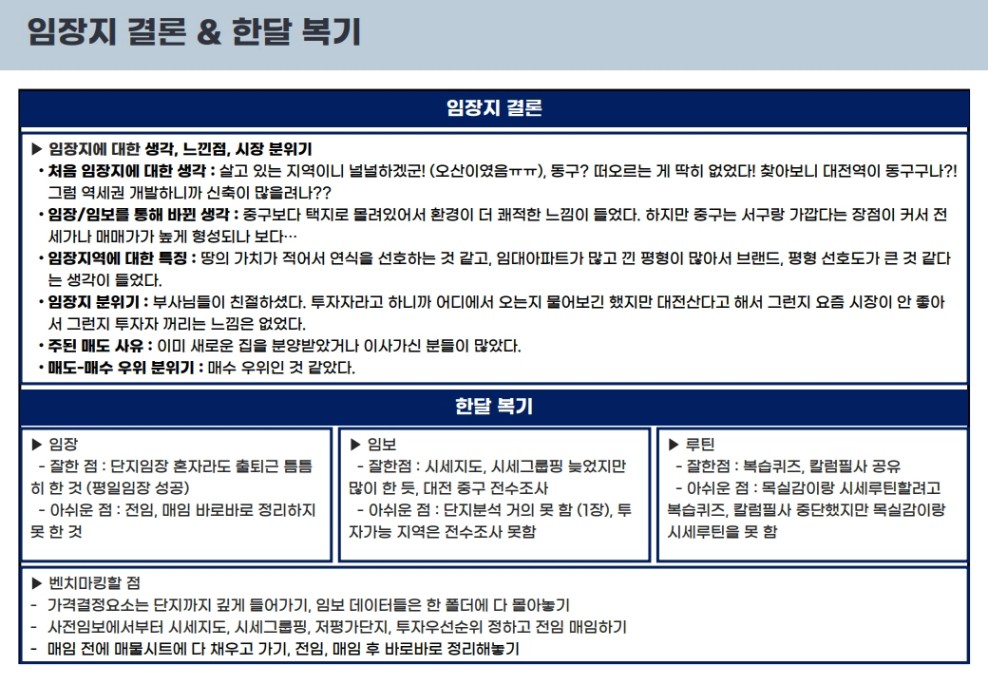다양한 시도를 해보면서 자산을 적극적으로 불려 나가려는 모습이 멋있었어요. 단지임장을 함께하지 못해 일정을 따라오기 쉽지 않겠다고 생각했었는데. 평일에 단지임장 채워나가는 모습을 보면서, 목표로 하시는 것들도 꼭 이루실 수 있겠다는 생각을 했습니다. 투자 준비하시는 것도 잘 마무리하세요~!
