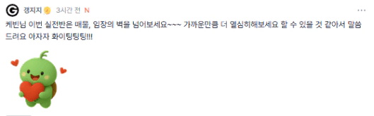 쪼코조장님 해주신 조언.. 잊지 않을게요 ㅎㅎ 어려움 속에서도 어떻게든 방법을 찾아 해내려는 모습에 정말 정말 많이 배웠습니다. 한 달 동안 우리 갱스터즈 이끌어주셔서 너무너무 감사드립니다. 저도 조장님의 길을 따라가는 투자자가 되도록 노력 많이 많이 하겠습니다.