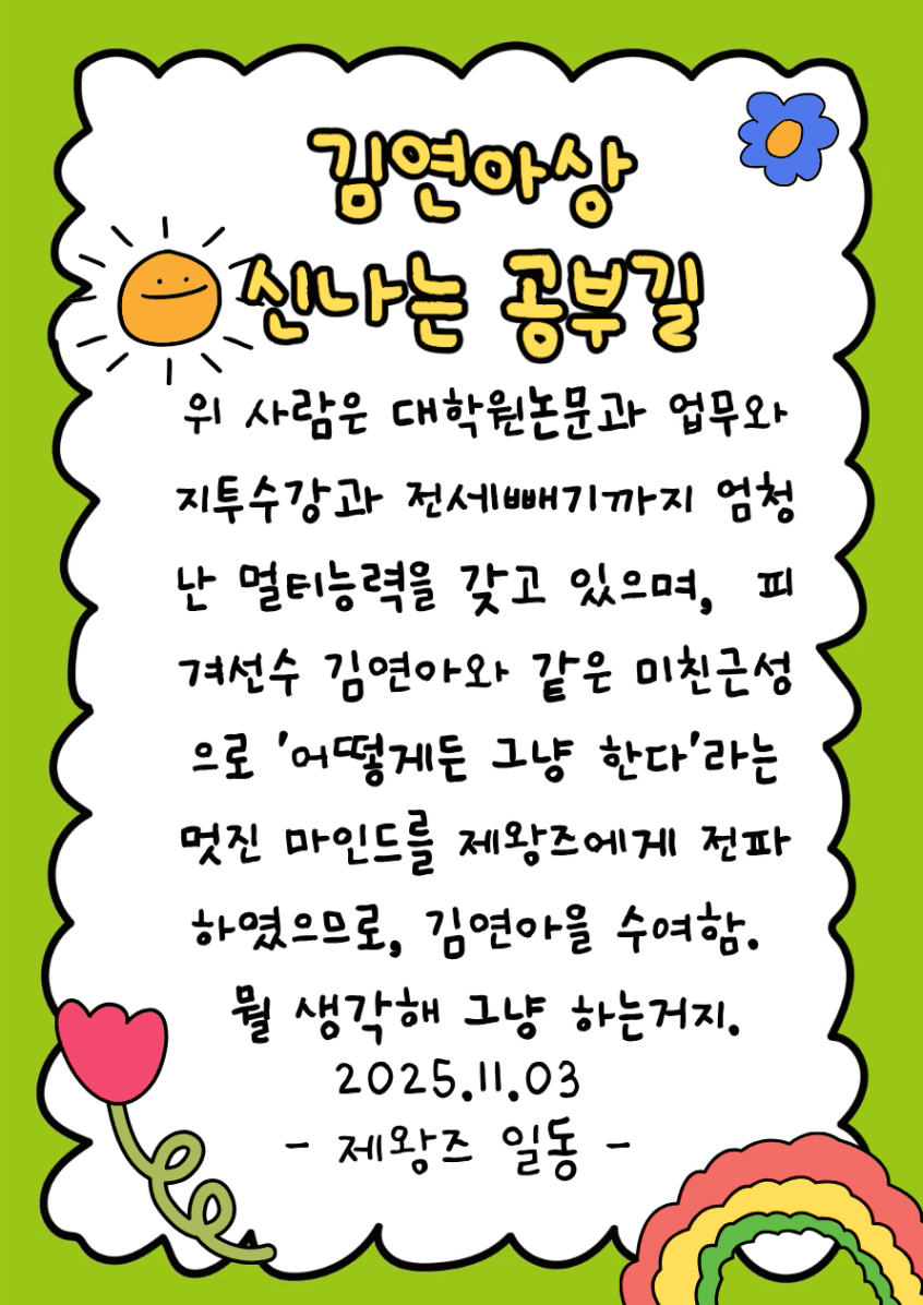 그래서 10월달의 노력들을 기억해, 그때의 노력과 집중의 에너지를 11월에도, 12월에도 또 다른 방식으로 적용하며 후회없는 시간들을 맞이하겠습니다. 한달 실전반에서 함께한 모두 고생 많았고, 우린 또 열정이 가득히 채워지는 시간을 기약하며 다시 만나요!