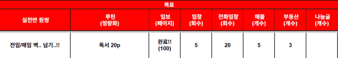 지난 지투기에서 처음으로 한 통 전임 하고 자신감이 아닌 지침을 얻고 나가 떨어졌다가 이번에는 실전반 환경을 이용하겠다는 마음으로 원씽을 전임/매임 벽 깨기로 잡고 튜터님, 조장님과의 이야기를 통해 평일 기준 1일 1회를 목표로 삼았었고, 한 달 동안 총 20회를 목표치로 정했다. (물론 분임 이후 평일 개수 기준으로 하면 16통이라서 하루에 2통 이상 채워야 하는 날도 있었음)