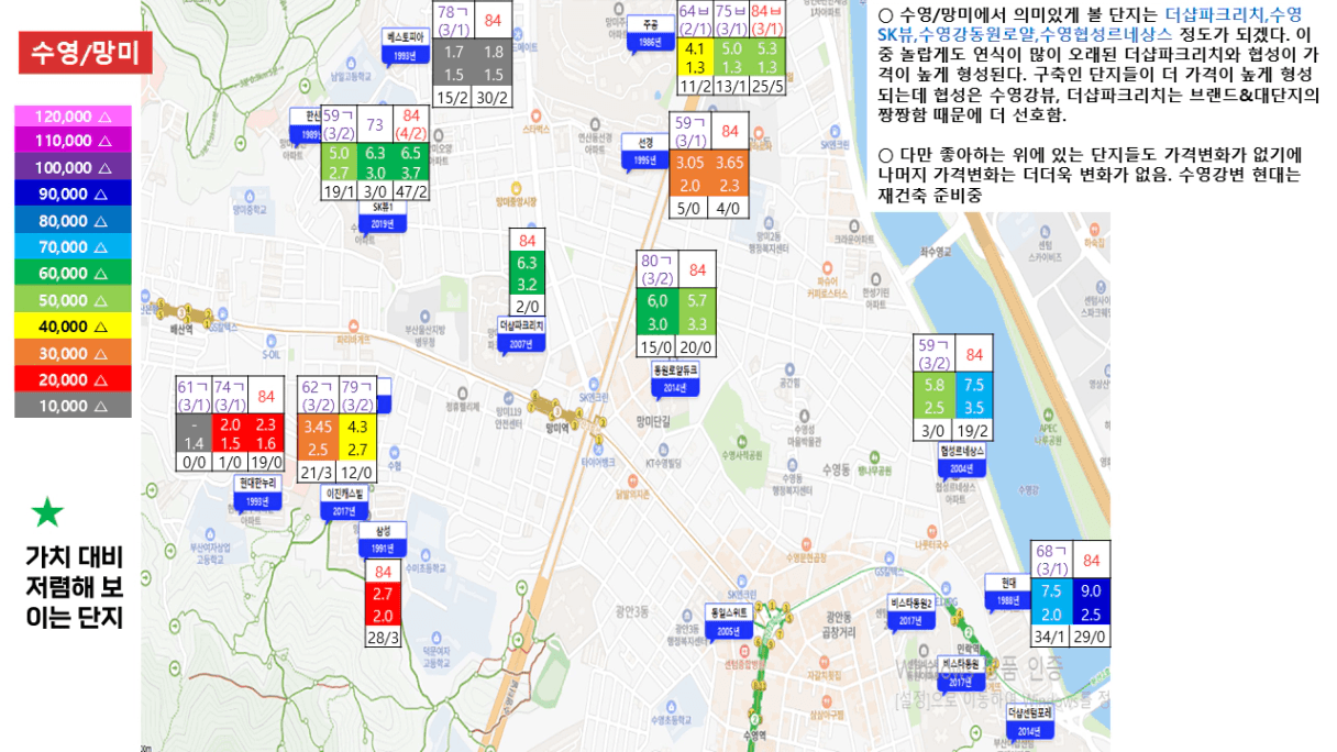 수영/망미에서 의미있게 볼 단지는 더샵파크리치,수영SK뷰,수영강동원로얄,수영협성르네상스 정도가 되겠다. 이중 놀랍게도 연식이 많이 오래된 더샵파크리치와 협성이 가격이 높게 형성된다. 구축인 단지들이 더 가격이 높게 형성되는데 협성은 수영강뷰, 더샵파크리치는 브랜드&대단지의 짱짱함 때문에 더 선호함. 다만 좋아하는 위에 있는 단지들도 가격변화가 없기에 나머지 가격변화는 더더욱 변화가 없음. 수영강변 현대는 재건축 준비중