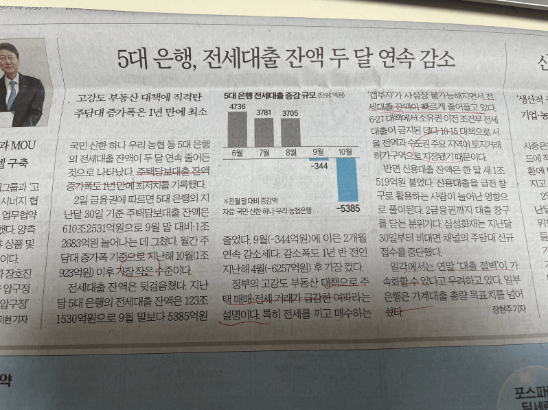 규제이후 전세대출 잔액이 감소하고 있다는 기사.
