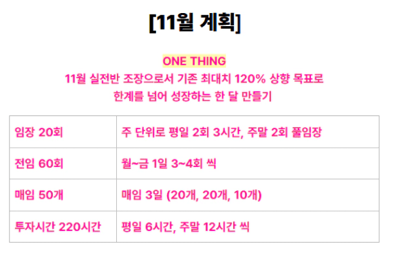 - 강의를 들은 후 11월 계획을 세우며 현장임장, 전화임장, 투자시간 정량적 목표를 모두 120% 상향한 목표를 세웠습니다.