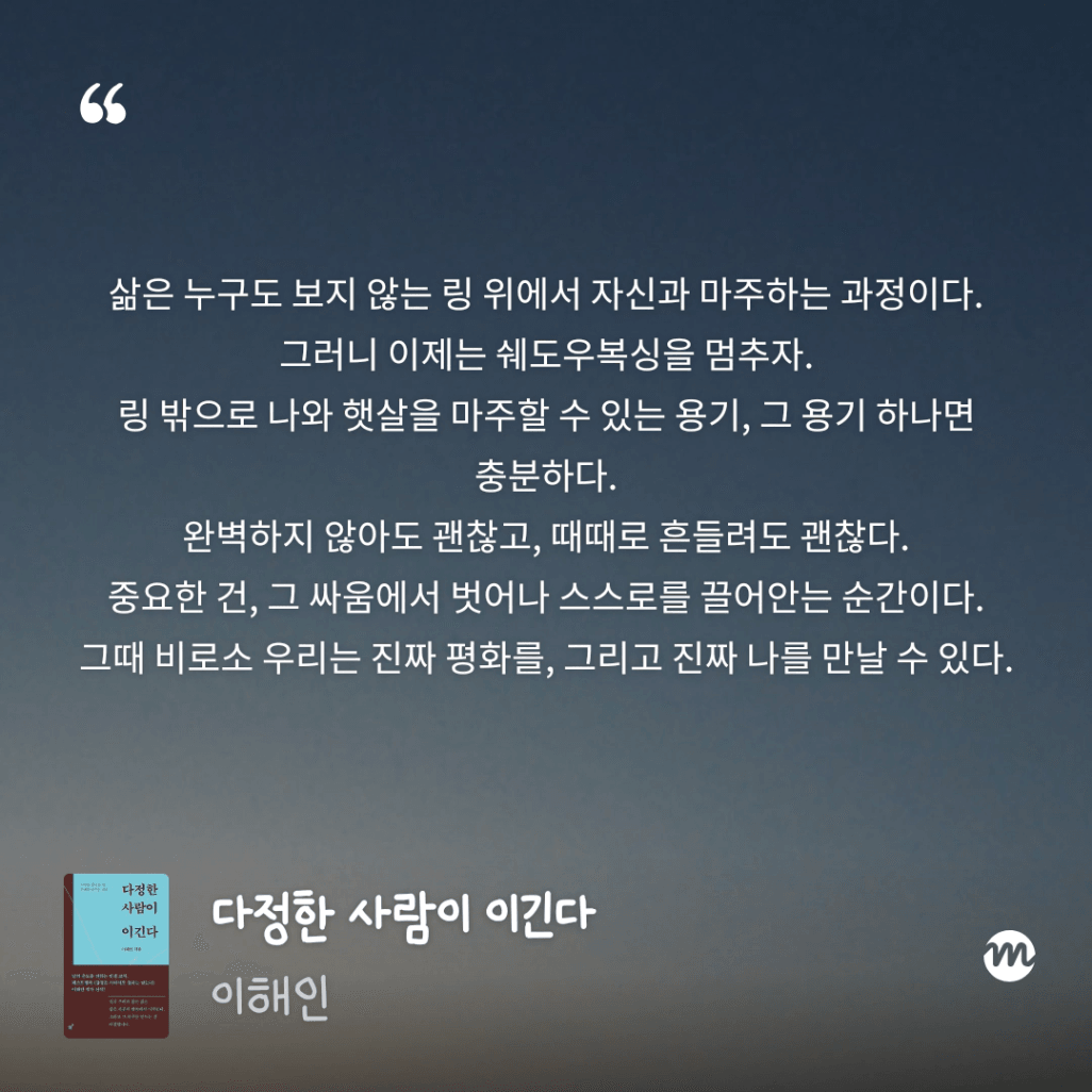 - 삶은 누구도 보지 않는 링 위에서 자신과 마주하는 과정이다. 그러니 이제는 쉐도우 복싱을 멈추자. 링 밖으로 나와 햇살을 마주할 수 있는 용기, 그 용기 하나면 충분하다.