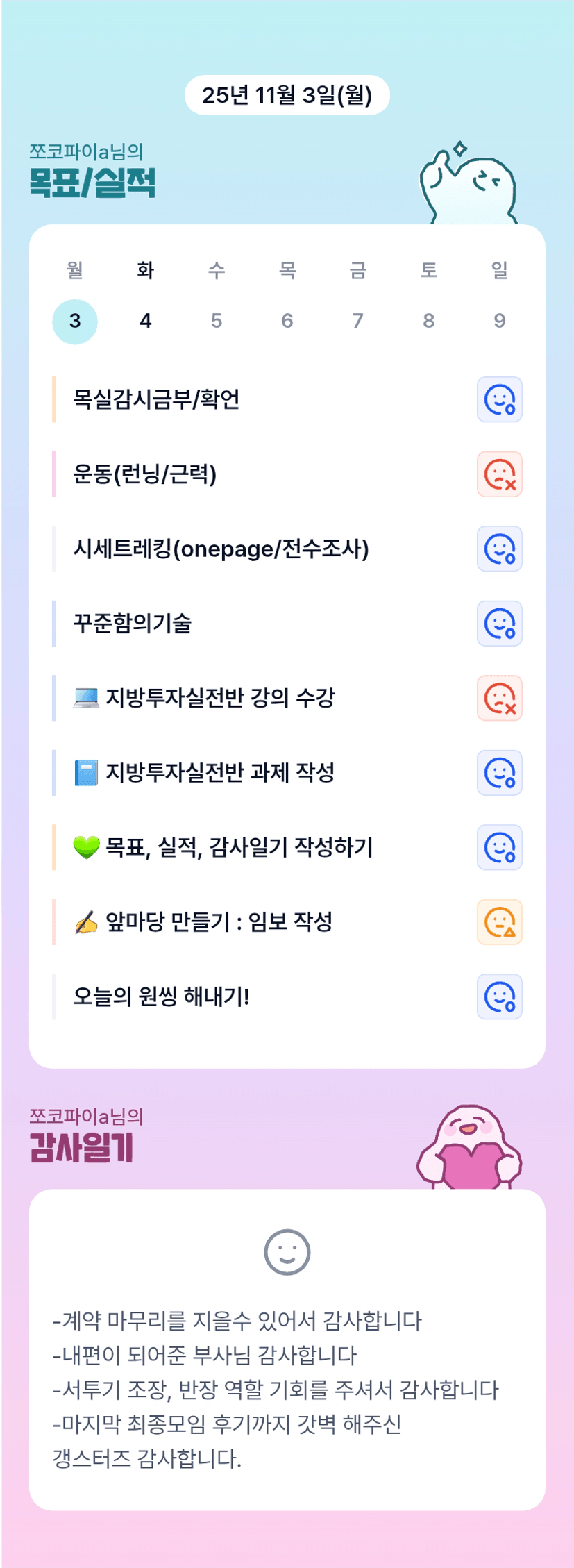 역시 울 조장님 반장까지!! 멋져! 매번 한번에 성공~ 갱스터즈 합 왜이렇게 좋죠?ㅎㅎ 여긴 어제보다 포근한데 쪼장님 계신 곳도 그랬음ㅎ 오늘도 힘내세요! :)