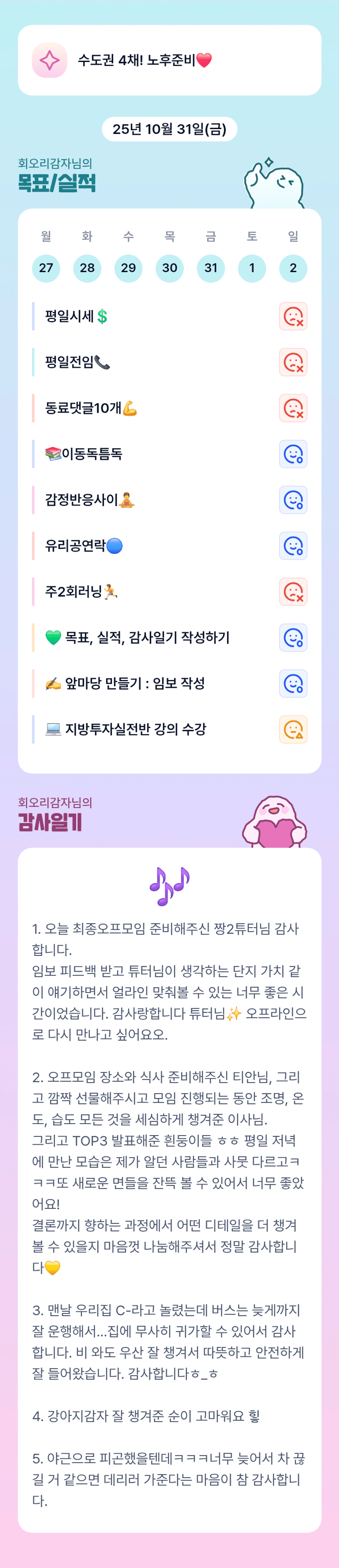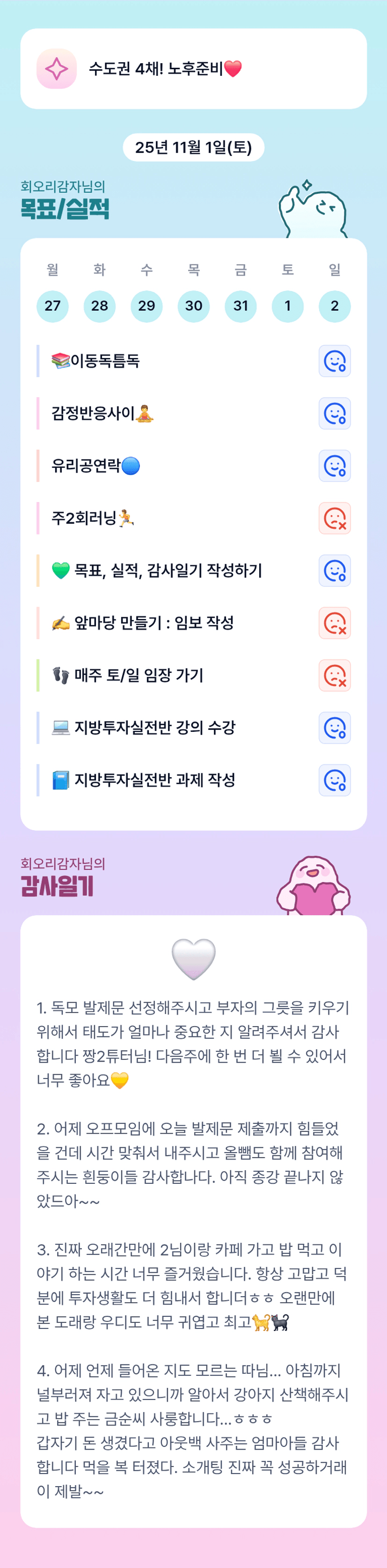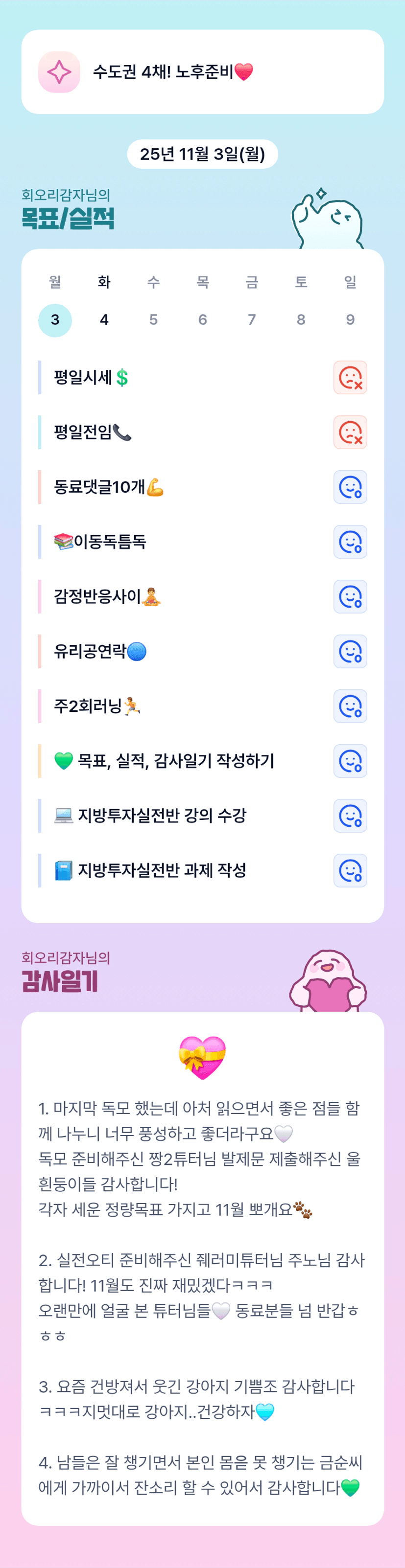 감자님 지투실전한달 너무 고생하셨어요-♡ 이번 실전반두 넘넘 응원하여요 추운겨울이 옵니다~~ 꽁꽁 싸매고 나가셔요!