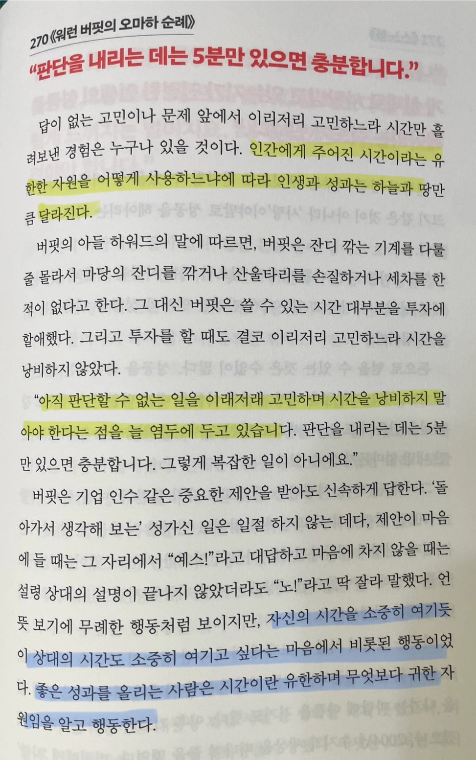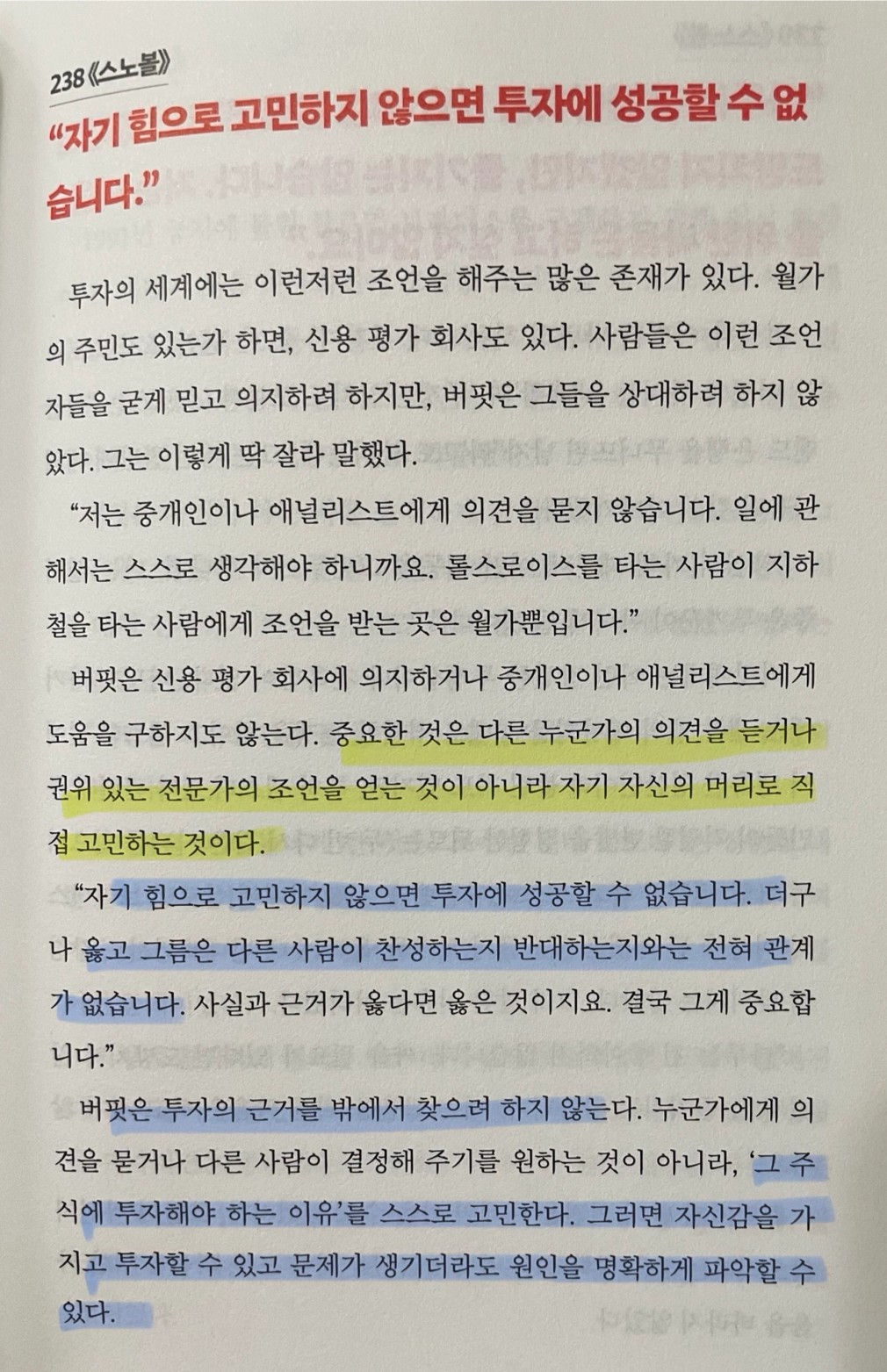 p.261 "자기 힘으로 고민하지 않으면 투자에 성공할 수 없습니다." .. 버핏은 투자의 근거를 밖에서 찾으려 하지 않는다. .. '그 주식에 투자해야 하는 이유'를 스스로 고민한다. 그러면 자신감을 가지고 투자할 수 있고 문제가 생기더라도 원인을 명확하게 파악할 수 있다.
