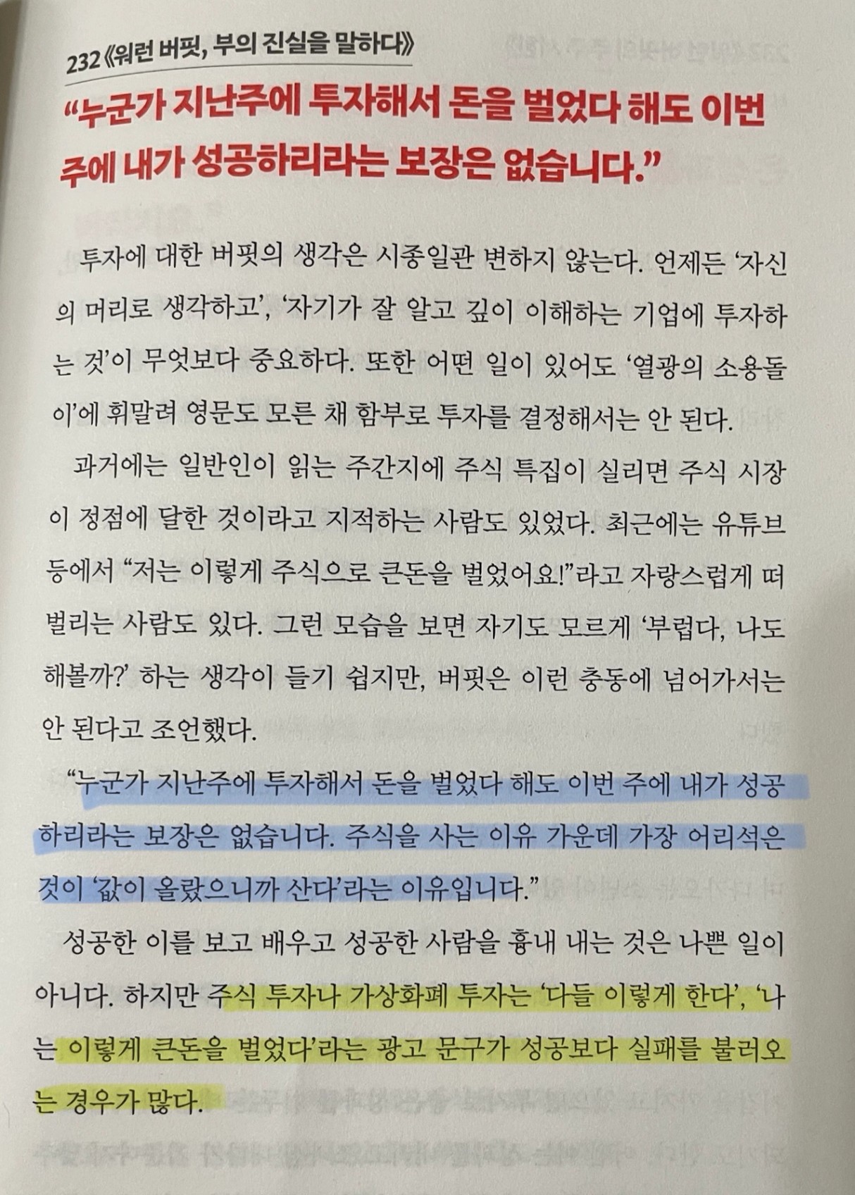 p.255 "누군가 지난주에 투자해서 돈을 벌었다 해도 이번 주에 내가 성공하리라는 보장은 없습니다. 주식을 사는 이유 가운데 가장 어리석은 것이 '값이 올랐으니까 산다'라는 이유입니다."