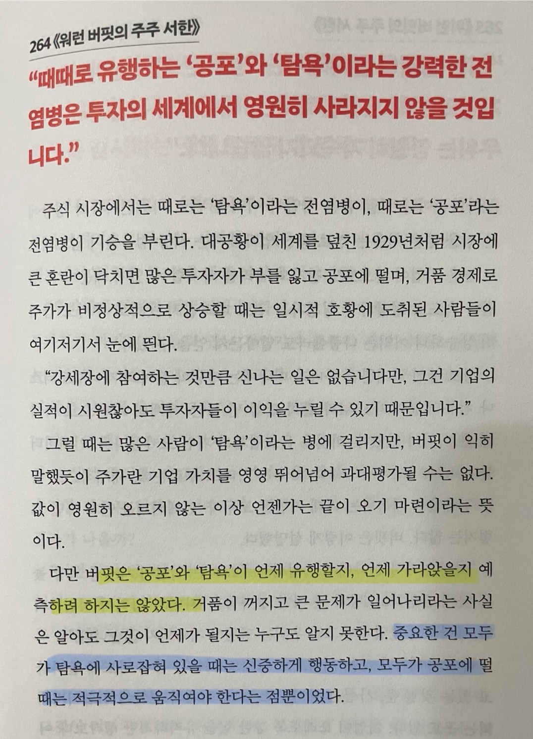 p.287 버핏은 '공포'와 '탐욕'이 언제 유행할지, 언제 가라앉을지 예측하려 하지는 않았다. .. 중요한 건 모두가 탐욕에 사로잡혀 있을 때는 신중하게 행동하고, 모두가 공포에 떨 때는 적극적으로 움직여야 한다는 점뿐이었다.