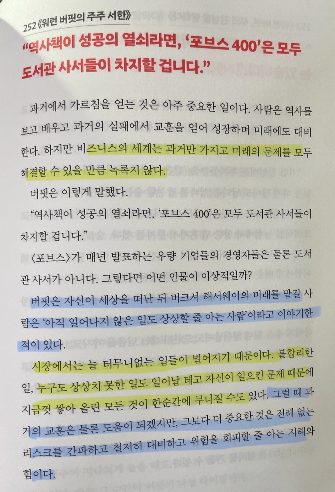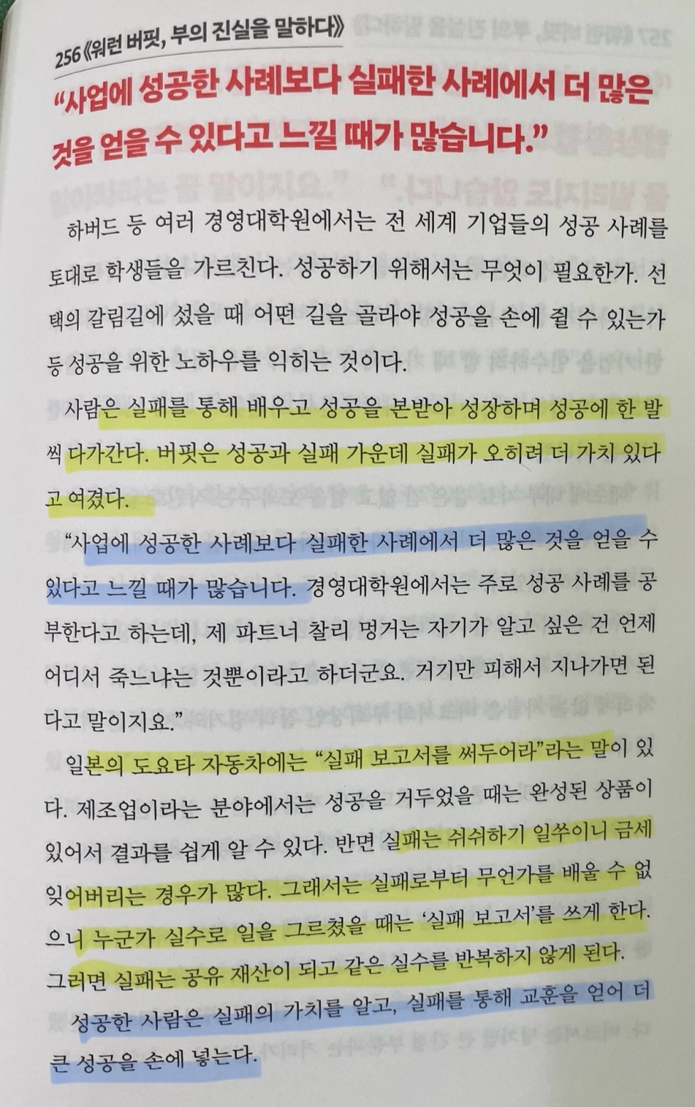 p.279 버핏은 성공과 실패 가운데 실패가 오히려 더 가치 있다고 여겼다. .. 성공한 사람은 실패의 가치를 알고, 실패를 통해 교훈을 얻어 더 큰 성공을 손에 넣는다.