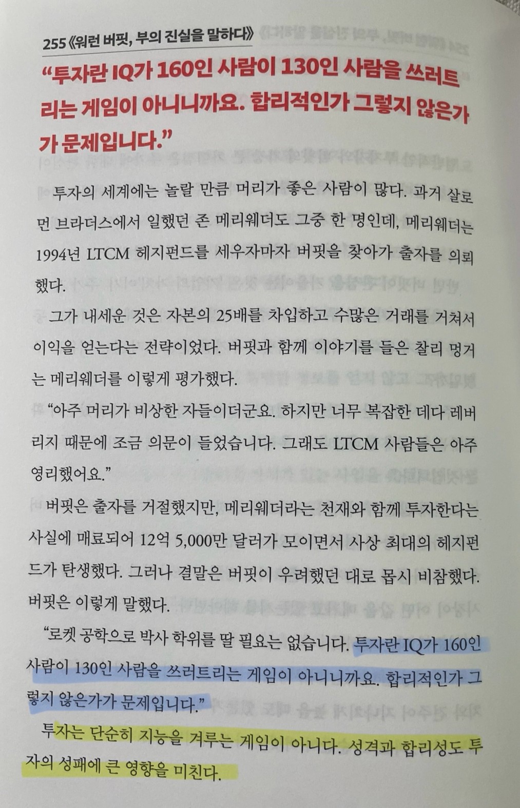 p.278 "투자란 IQ가 160인 사람이 130인 사람을 쓰러트리는 게임이 아니니까요. 합리적인가 그렇지 않은가가 문제입니다." 투자는 단순히 지능을 겨루는 게임이 아니다. 성격과 합리성도 투자의 성패에 큰 영향을 미친다.