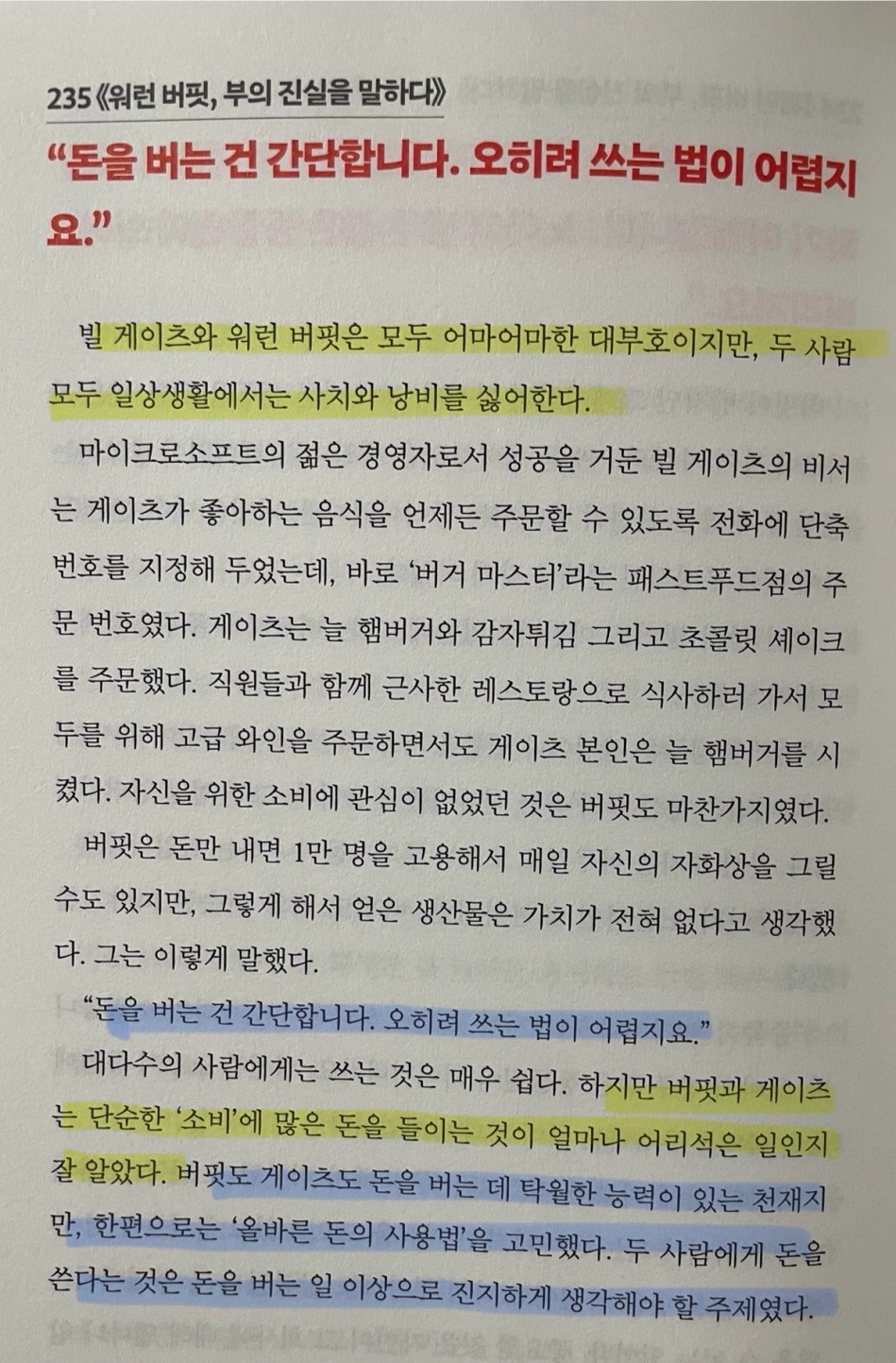 워런 버핏과 빌 게이츠는 엄청난 부자지만, 사치와 낭비를 싫어하고 식사로 햄버거를 자주 먹는 소박함이 공통점이네요. 올바른 돈 사용법을 진지하게 고민하고 어마한 돈을 기부하는 세계 최고 부자들, 정말 멋집니다. 무엇이 진정한 성공인가, 질문을 던지는 게 이 책의 매력인 듯요. 오늘도 즐겁게, 충실하게 화이팅입니다💕