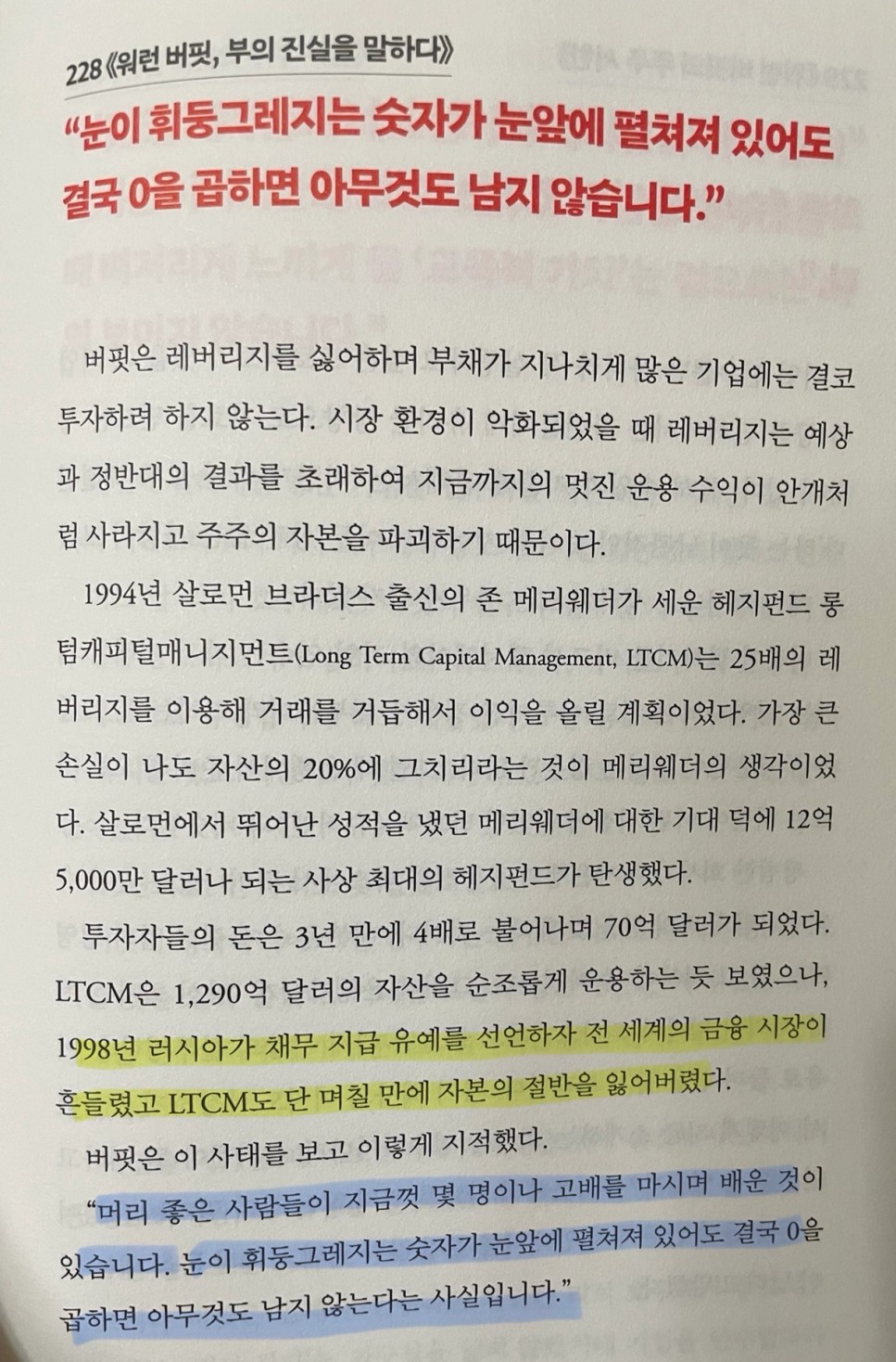 p.251 "머리 좋은 사람들이 지금껏 몇 명이나 고배를 마시며 배운 것이 있습니다. 눈이 휘둥그레지는 숫자가 눈앞에 펼쳐져 있어도 결국 0을 곱하면 아무것도 남지 않는다는 사실입니다."