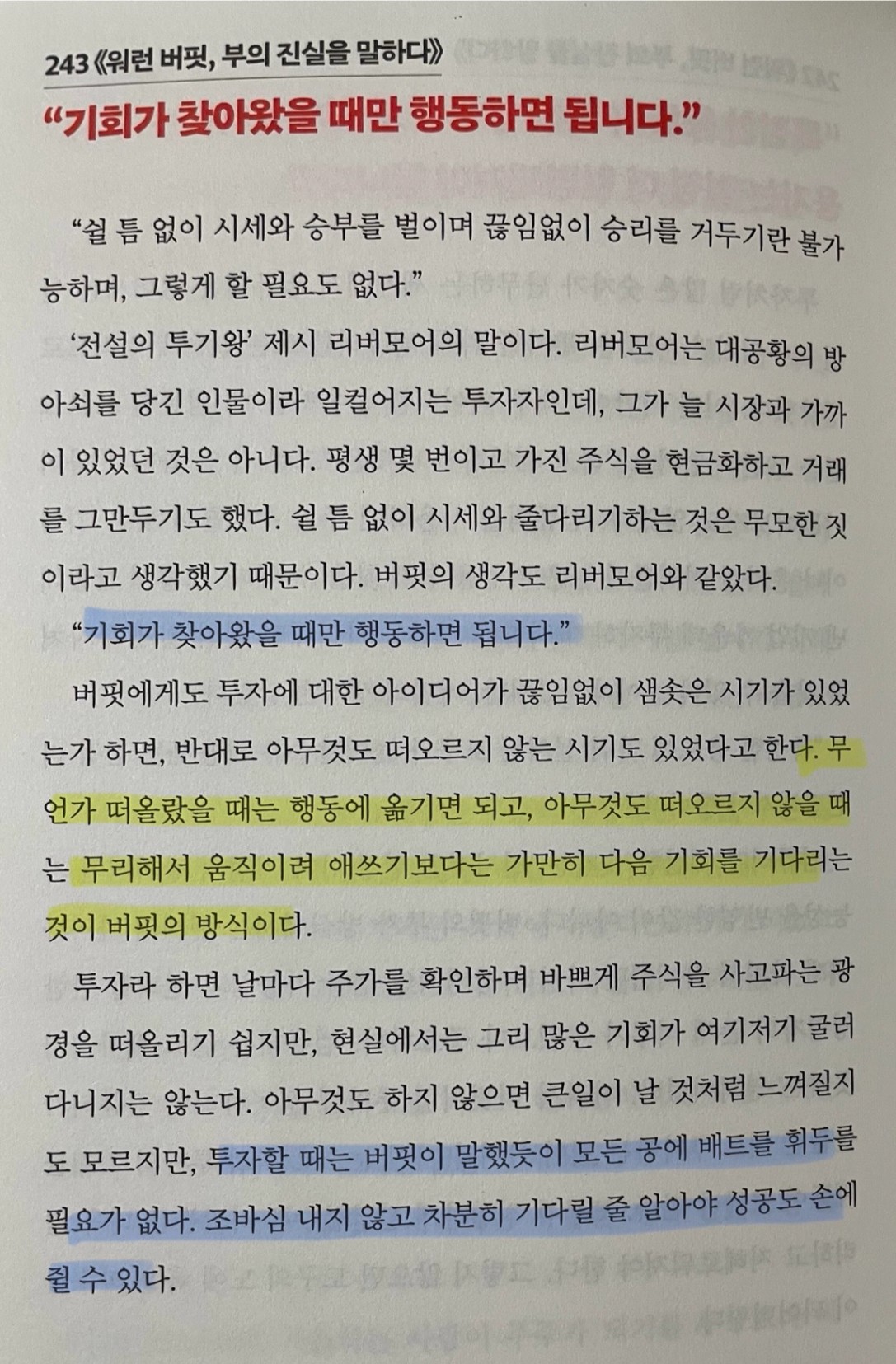 p.266 "기회가 찾아왔을 때만 행동하면 됩니다." .. 투자할 때는 버핏이 말했듯이 모든 공에 배트를 휘두를 필요가 없다. 조바심 내지 않고 차분히 기다릴 줄 알아야 성공도 손에 쥘 수 있다.