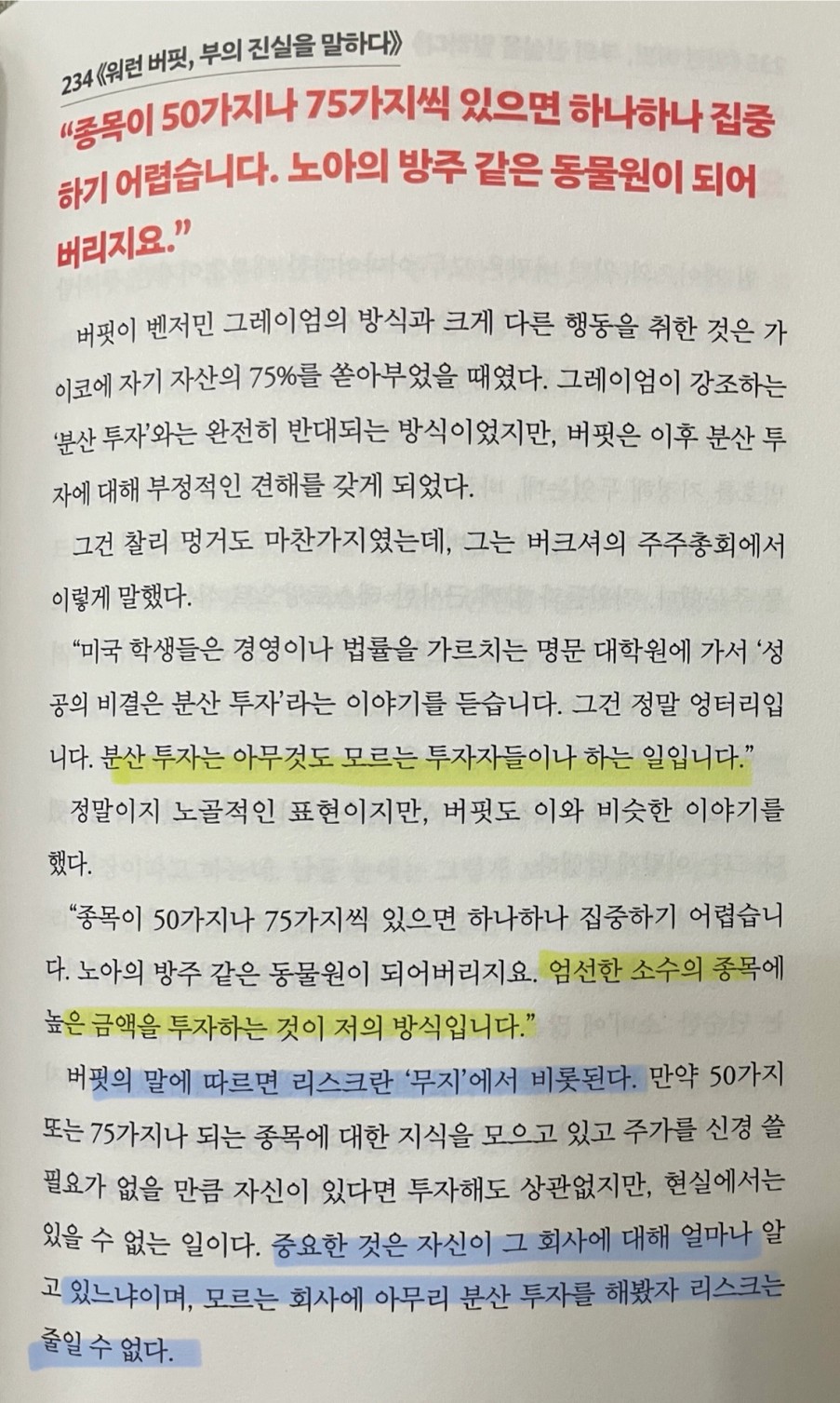 p.257 버핏의 말에 따르면 리스크란 '무지'에서 비롯된다. .. 중요한 것은 자신이 그 회사에 대해 얼마나 알고 있느냐이며, 모르는 회사에 아무리 분산 투자를 해봤자 리스크는 줄일 수 없다.