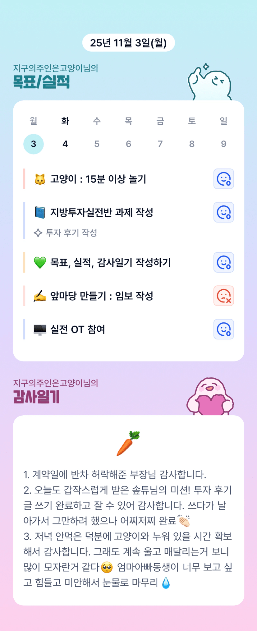 양이님 혼자서 그 많은 어려운일들과 싸워 이겨내느라 너무 애 많이 쓰셨습니다! 서럽고 불안한 날들의 연속이지만 꿋꿋하게 버텨내는 양이님께 진심으로 애써줘서 고맙고 자랑스럽다고 말씀드리고 싶네요! 같은 투자동료로써 늘 응원합니다!