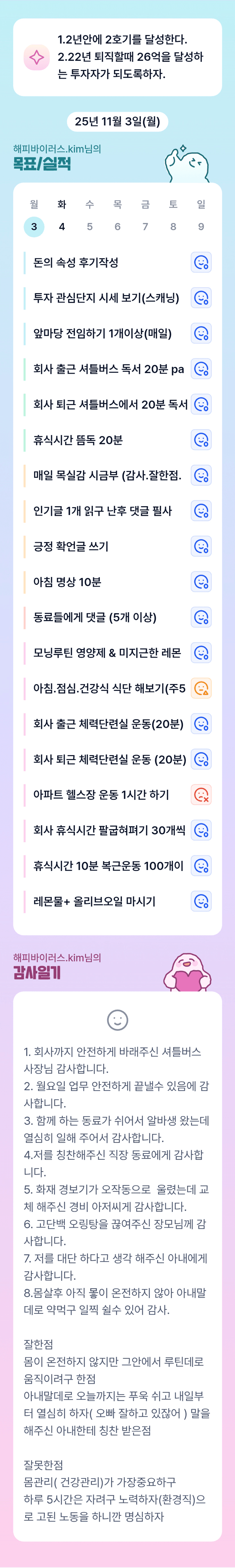 해피님 정말 절제된 하루 하루를 살아가시는 모습이 너무 대단하십니다. 많은 책에서 수면을 강조하던데 충분한 수면 확보 하셔서 건강도 잘 챙기시는 멋진 투자자 되세요~!!