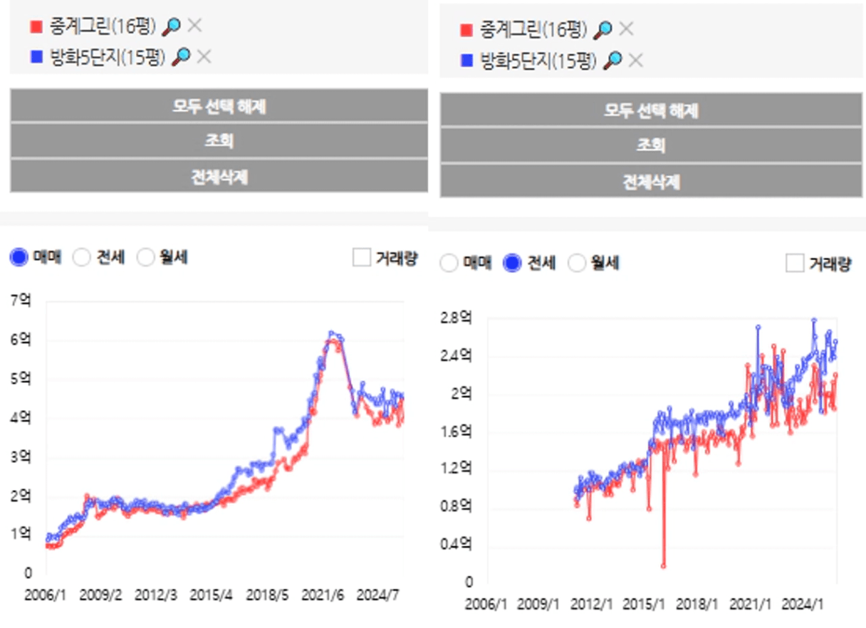 하지만 전세가는 방화5단지가 높은 것을 확인해볼 수 있습니다.