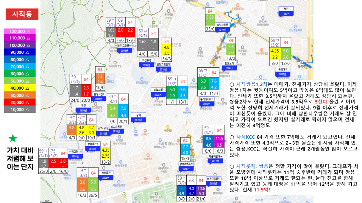 사직KCC 84 가격 또한 7억에도 거래가 되고있다. 전세가격가격 또한 4.3억으로 2~3천 올랐는데 지금 사직에 있는 쌍용,KCC는 확실히 가격이 근래 2개월동안 많이 오르고 있다. 또한 사직롯캐, 쌍용은 정말 가격이 많이 올랐다. 그래프가 서울 모양인데 사직롯캐는 11억 중후반에 거래가 되며 쌍용 또한 10억 이상으로 거래도 잘되는 편. 둘다 전고를 향해 달려가고 있고 동래 대장은 11억을 넘어 12억을 향해 가고 있다. 현재 11.5억!